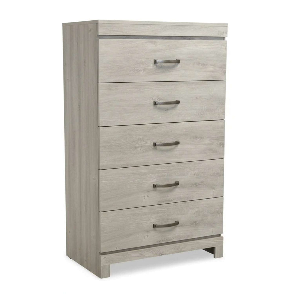 This 5-drawer chest combines clean lines and modern simplicity for a timeless look. Built from durable engineered wood with a light, weathered gray finish, it offers ample storage for clothing and essentials. Each drawer glides smoothly and features sleek metal handles for a contemporary touch. Perfect for bedrooms or guest spaces, this dresser’s neutral tone blends effortlessly with a variety of décor styles while adding a refined, functional accent.