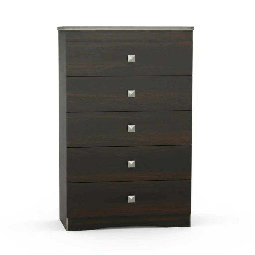 A contemporary five-drawer chest featuring sleek square metal knobs for a modern touch. Built from durable engineered wood, it offers smooth drawer operation and ample storage for clothing and accessories. Its clean lines and compact design make it a perfect addition to any bedroom or guest space.