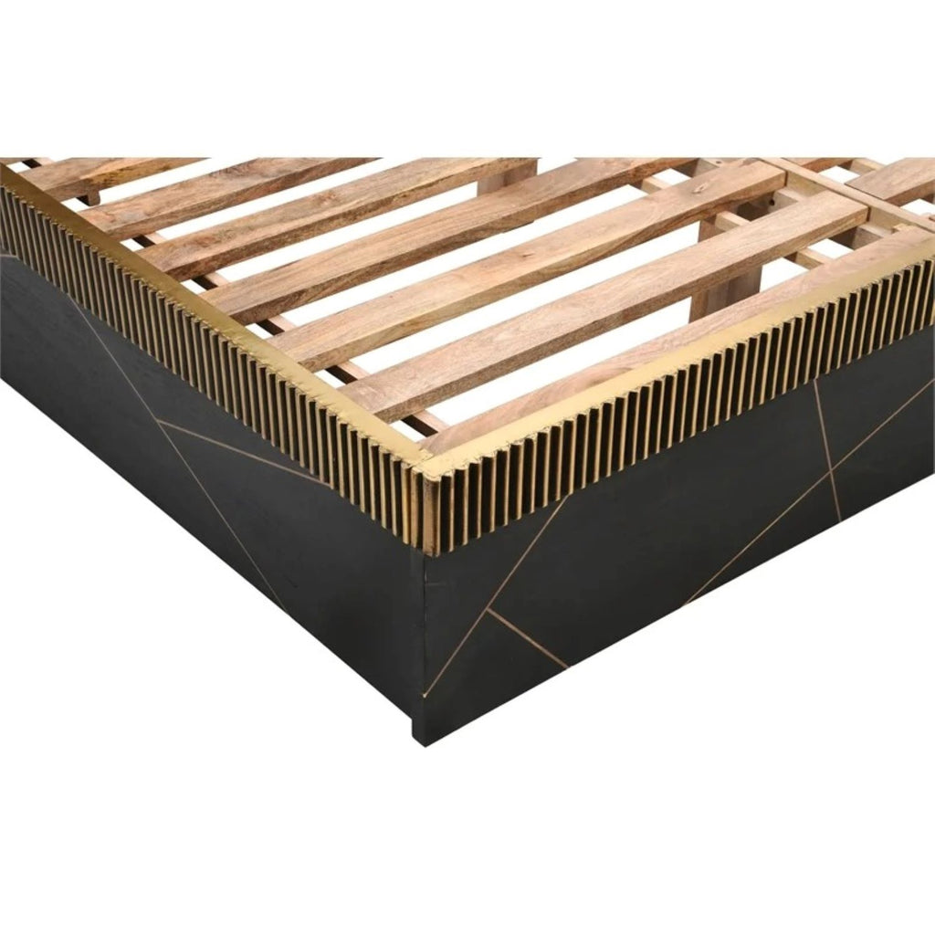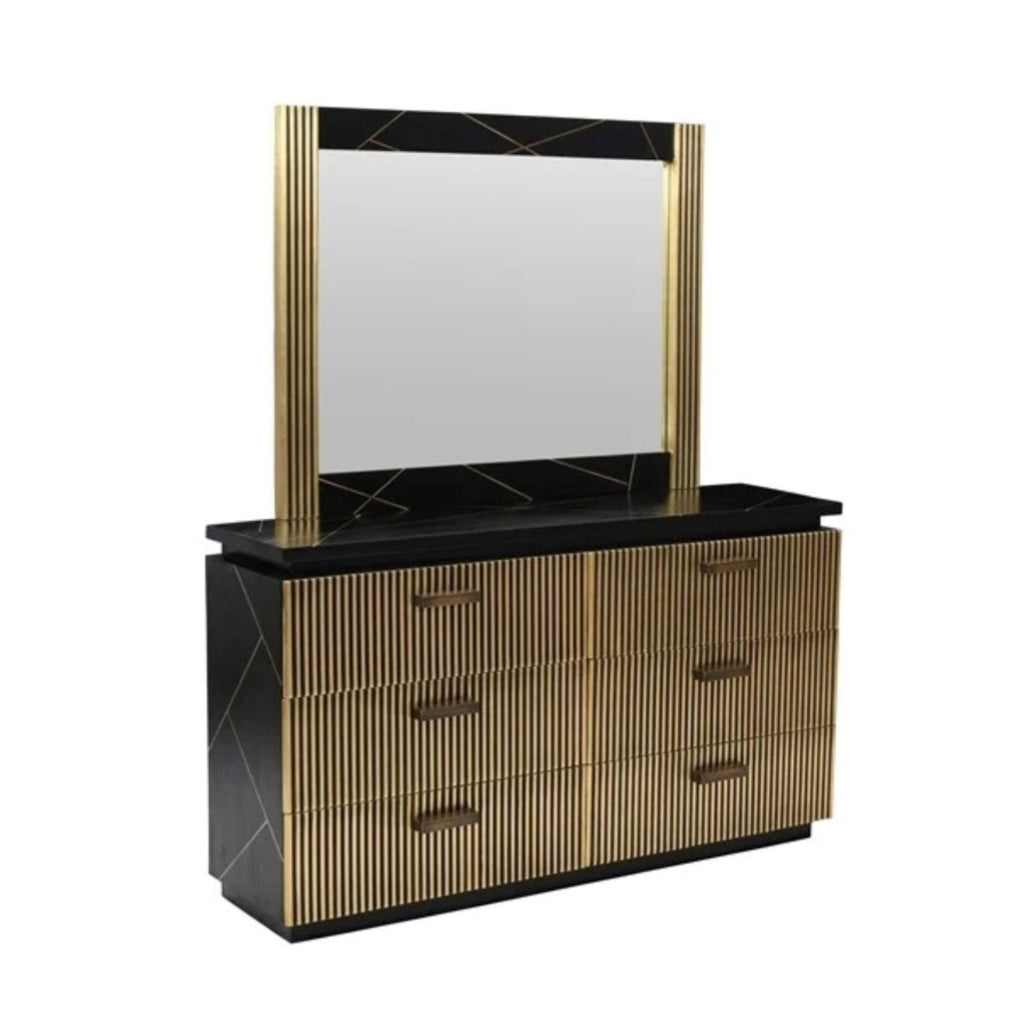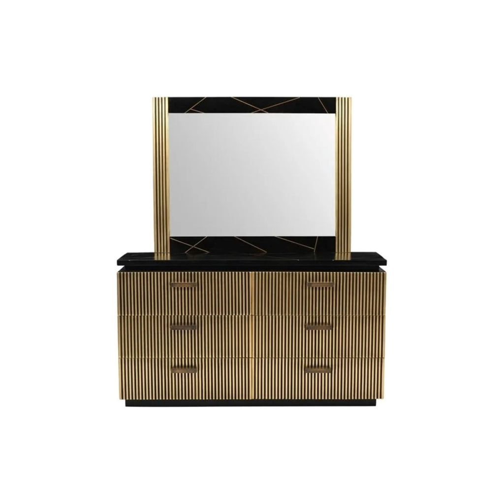 Elevate your bedroom with the Allure Solid Wood Bedroom Set, a refined blend of craftsmanship and contemporary design. This elegant collection crafted from durable solid wood. The upholstered headboard with vertical paneling and gold inlay detailing adds a sophisticated modern accent, while the sleek black and gold finishes ensure lasting style and strength. Perfect for those seeking both luxury and quality in their bedroom furnishings.