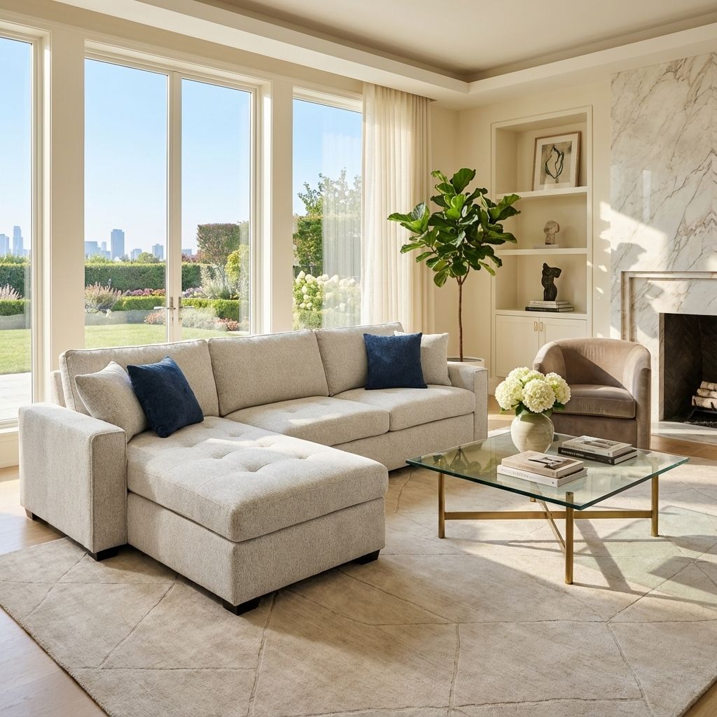 - Linen weave fabric reversible sofa in sand color. Reversible design to make it either left- or right-hand facing depending on your needs.