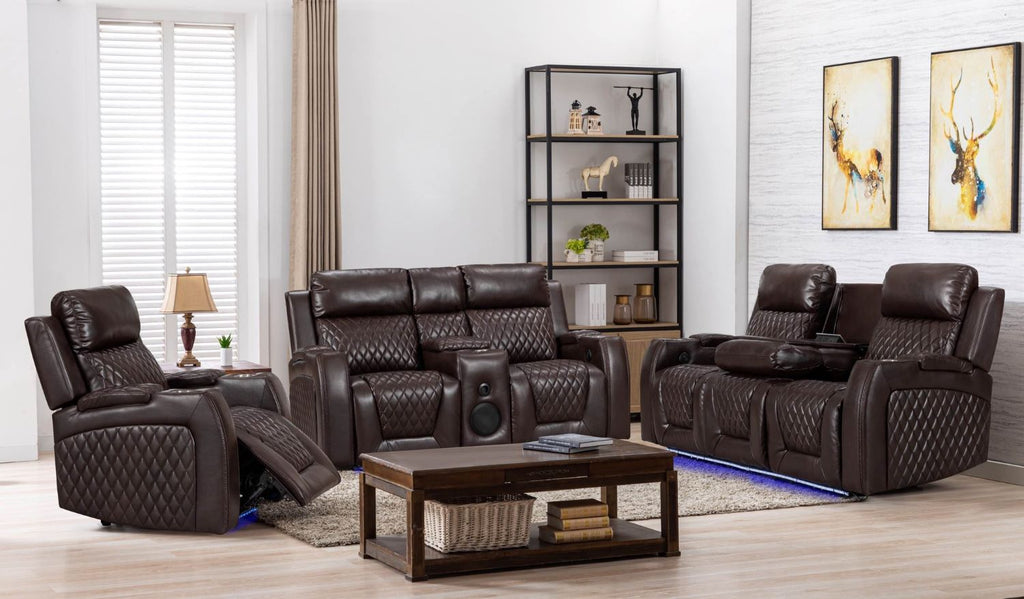Experience refined comfort and modern convenience with the Arlington Brown Power Recliner Sofa Set. This elegant living room ensemble features a sofa, loveseat, and chair crafted for relaxation and style. Enjoy integrated fold-down trays, a high-quality built-in speaker system, convenient cup holders, power outlets, and ambient lighting—all designed to enhance your living space with effortless luxury and functionality. Perfect for unwinding while staying connected and entertained, this electric reclining set redefines sophisticated comfort.