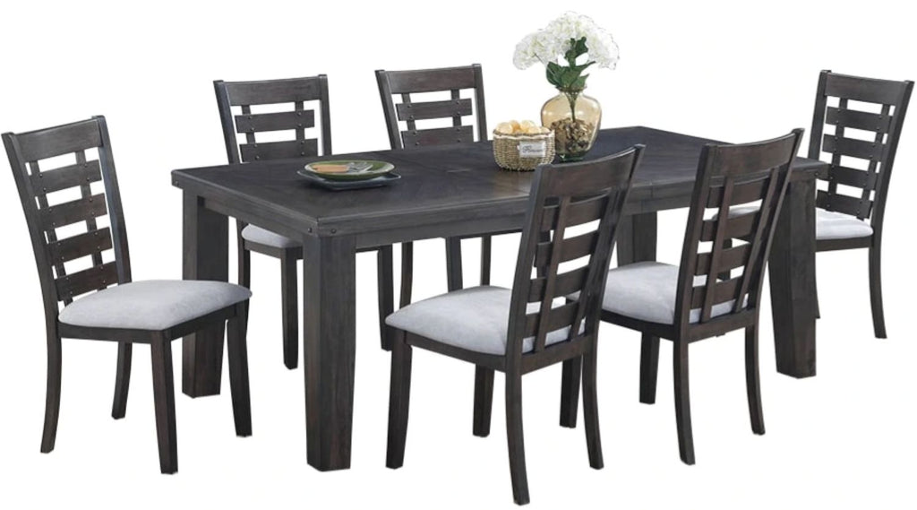 Elevate your dining space with the Bailey 7-piece dining set, combining sophisticated design and lasting durability. The extendable solid wood table features a beautifully inlaid veneer top and a convenient leaf, perfect for hosting intimate dinners or larger gatherings. Its contemporary extra-wide legs enhance stability and style. Six matching chairs, crafted from wood with elegant inlays, offer a ladder-back design and foam seats with contrasting densities for exceptional comfort. This set seamlessly blends refined craftsmanship with practicality, making every meal an elegant experience.