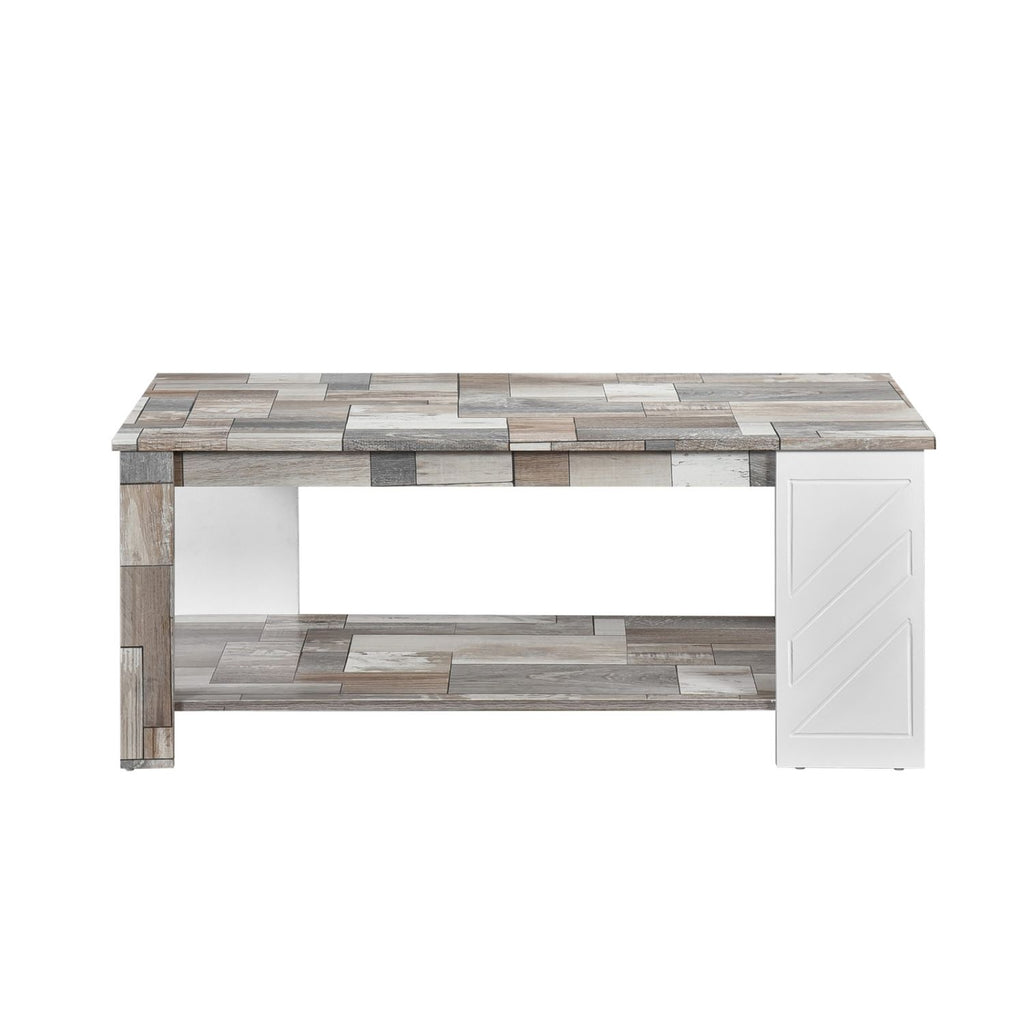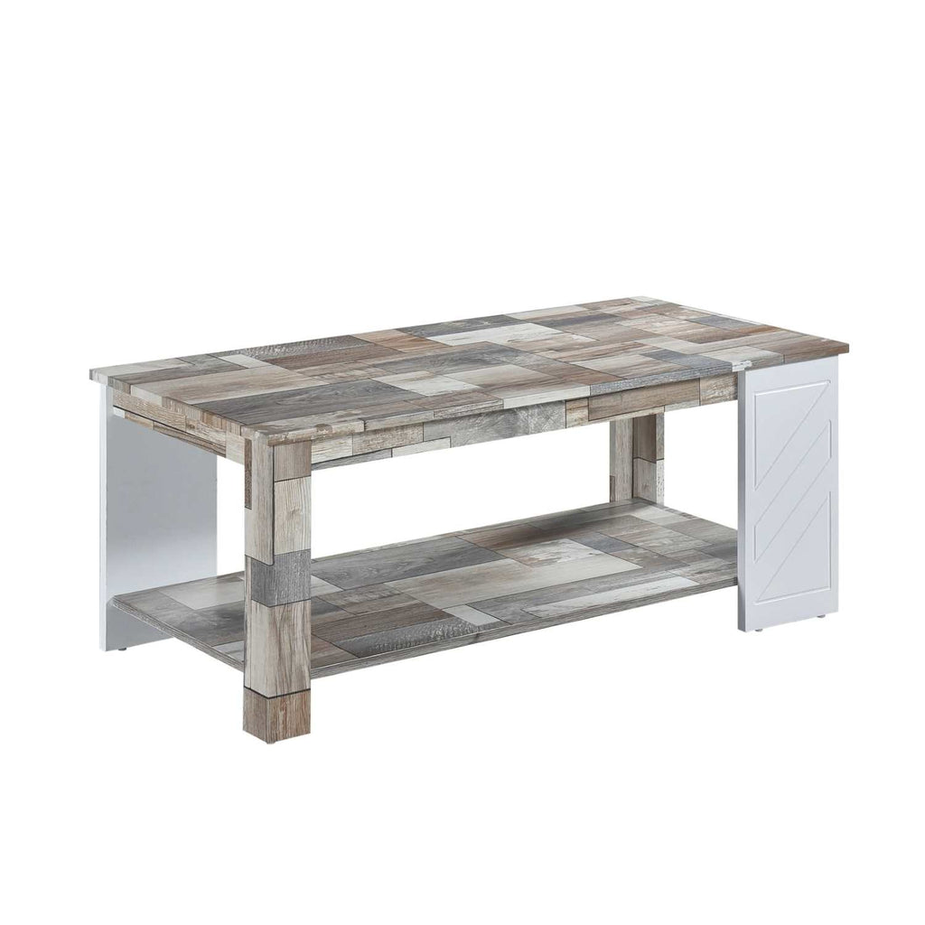 With its eye-catching assortment of colours and textures, the Brooke Collection brings an impactful presence to your modern living room. Sturdily constructed from engineered wood, this coffee table's rectangular design has a touch of whimsy thanks to the contrasts of its eclectic textured appearance. Two white panels act as legs while also doubling as an anchoring accent to the multi-hued grey wood finishes, which are laid out in an attractive patchwork pattern. The patchwork medley of wood panels uses 3D smartfoil technology to achieve a deceptively realistic faux wood effect with detailed graining, resulting in a surprisingly lightweight faux wood table that is easy to clean and maintain. A durable lower open display shelf offers ample room for your your books and baubles, proving that the Brooke has both functionality and flair.