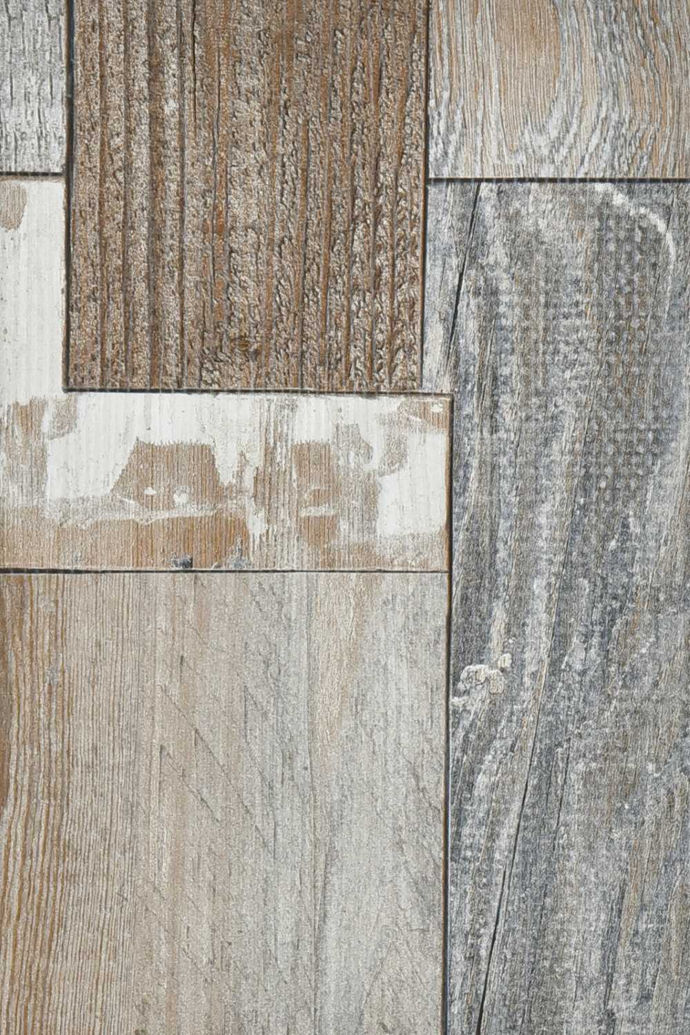 - Contemporary effect created by rustic grey faux wood panels in a patchwork pattern