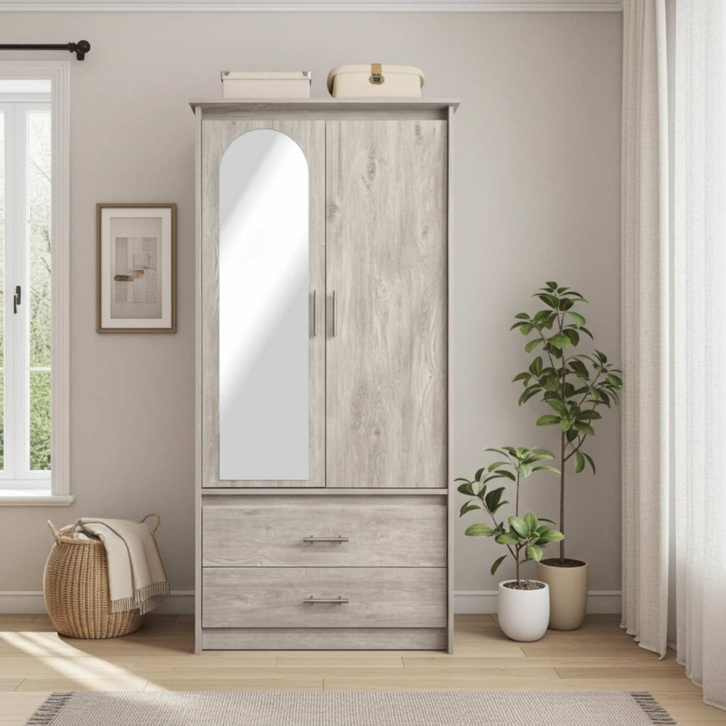 This Wardrobe provides ample storage and organization options with four doors, shelf space and engineered wood construction. Crafted in Canada and fully assembled, this wardrobe is a great value and includes a mirror for added convenience.