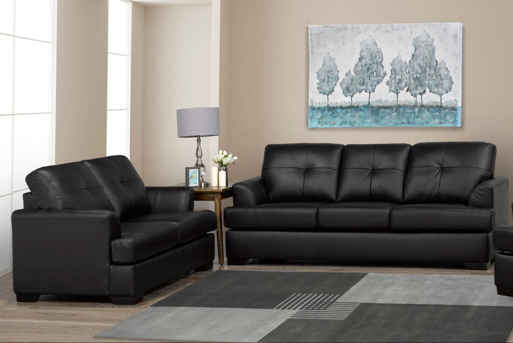 Expertly crafted with Canadian kiln-dried hardwoods and high-quality engineered wood, the Zurick Black leather sofa collection offers exceptional stability and support. The 2.2 LB density foam and fibre wrapped seats provide both comfort and durability, while the pillow back fibre and genuine top grain leather wrap you in luxury. Solid wood legs add the finishing touch to this Canadian made collection.