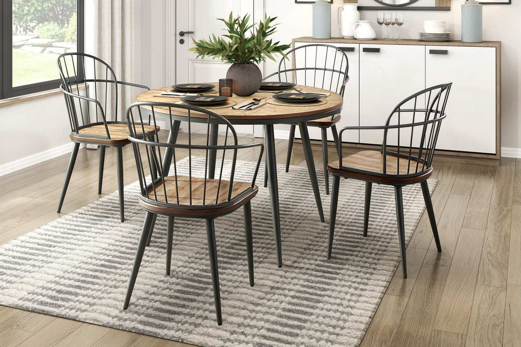 Elevate your dining experience with the Canton 5-piece wooden round dining set. This thoughtfully designed collection features a striking round table paired with four coordinating chairs, creating an inviting focal point for any dining room. The circular table design encourages intimate conversation while maximizing seating flexibility, while the wooden construction ensures lasting durability and timeless appeal. Perfect for both everyday meals and special gatherings, this set combines functional elegance with refined craftsmanship.