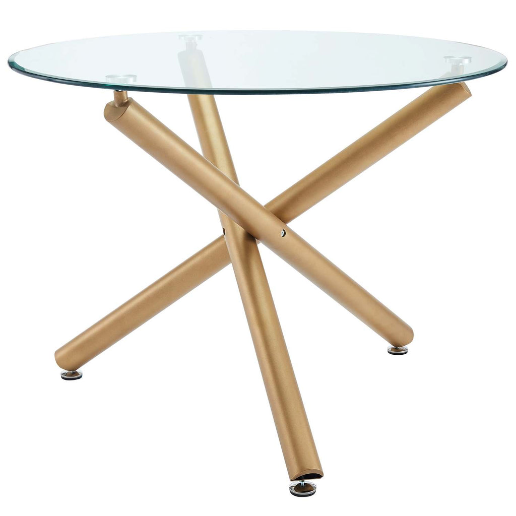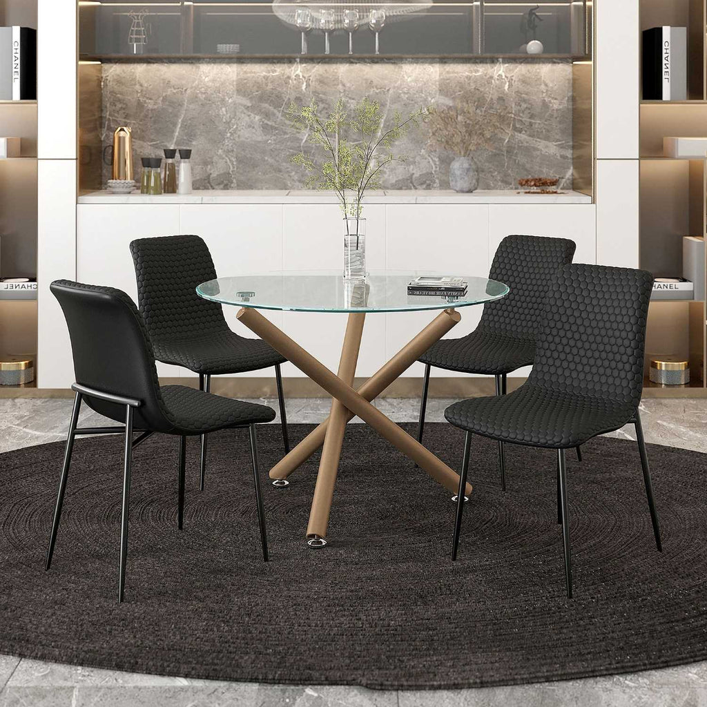 The Carmilla / Brixx 5pc Dining Set features a sleek 10mm clear tempered glass top accented by brushed stainless steel, paired with metal legs finished in elegant aged gold with a sturdy crossover design. Complemented by modern black faux leather chairs with matte black metal legs, each chair offers medium-firm polyester foam cushioning and refined hexagon-stitch detailing for lasting comfort and style. This set harmonizes contemporary sophistication with durable craftsmanship, perfect for elevating your dining space.
