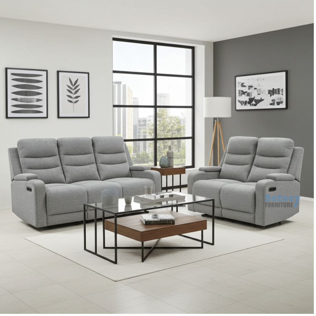 - Designed for utmost comfort and support, sofa has generously padded arms, high thick back, drop down tray with cup holders and high- grade fabric material in grey;