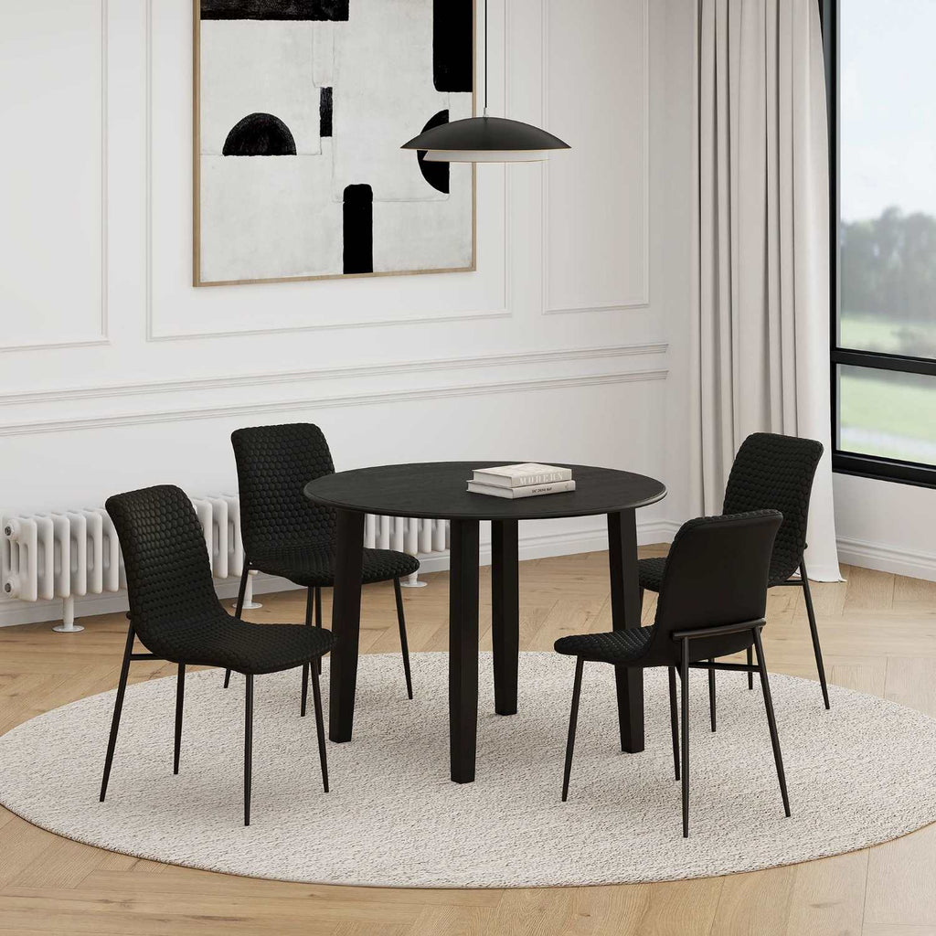 The Conrad / Brixx 5pc Dining Set features a sleek 42" round drop-leaf table with an 8" extension on each side, ideal for optimizing smaller spaces. Crafted with a black-finished engineered wood top showcasing subtle wood grain, it rests on sturdy solid rubberwood legs. Complementing the table are modern faux leather chairs with hexagon-stitch detailing, medium-firm polyester foam cushions, and matte black metal legs, combining refined style with comfortable seating. Each chair supports up to 250 lbs with a seat height of 17.75", blending functionality and contemporary elegance.