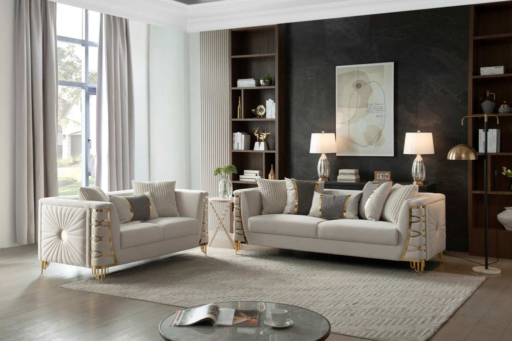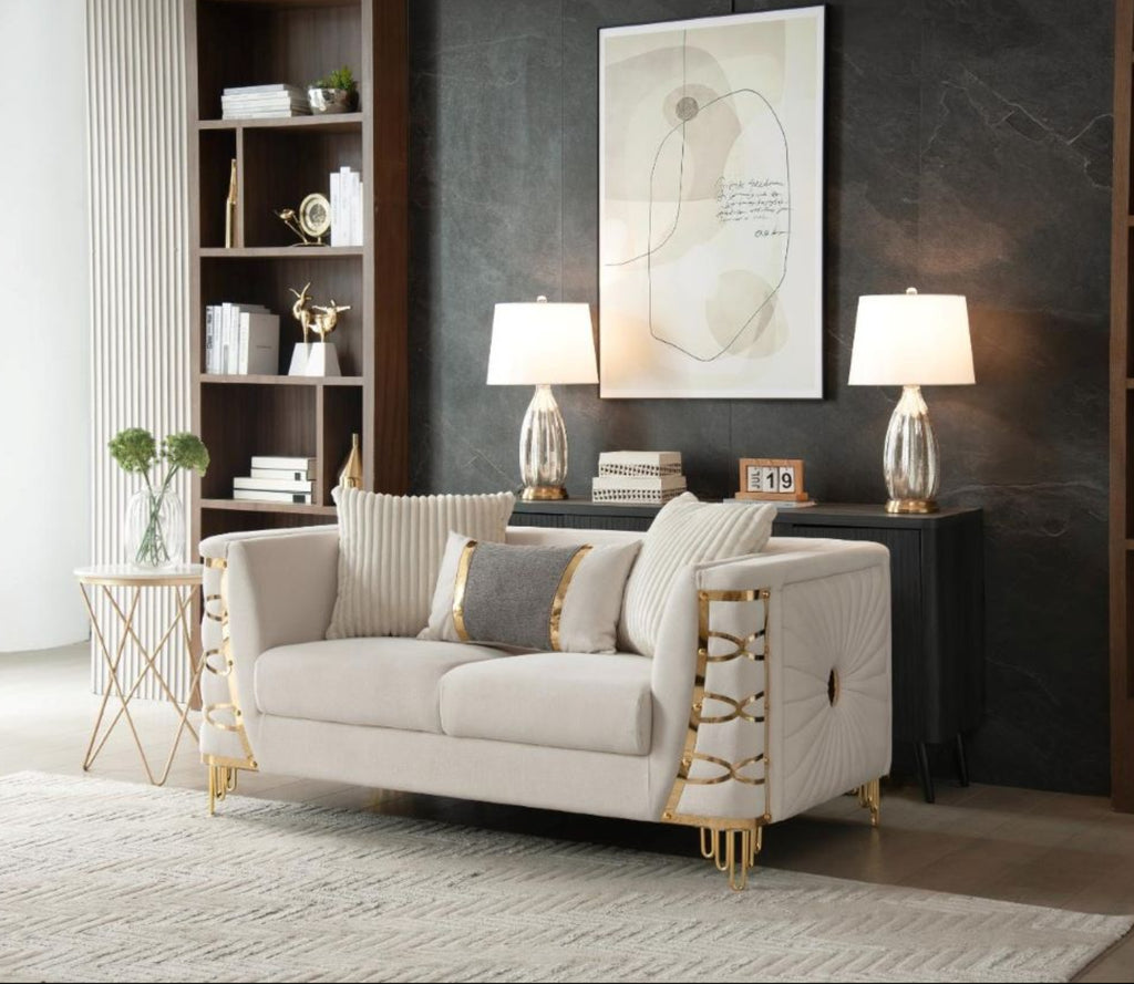 Transform your home with the Luxe Beige 3-Piece Living Room Set, a carefully crafted combination of sophistication, comfort, and style. This set, featuring a plush three-seater sofa, an elegant loveseat, and a stylish armchair, is wrapped in a calming beige fabric that effortlessly blends classic beauty with modern luxury. Each piece showcases unique quilted patterns and stunning gold accents, making this collection a refined centerpiece for any living space.