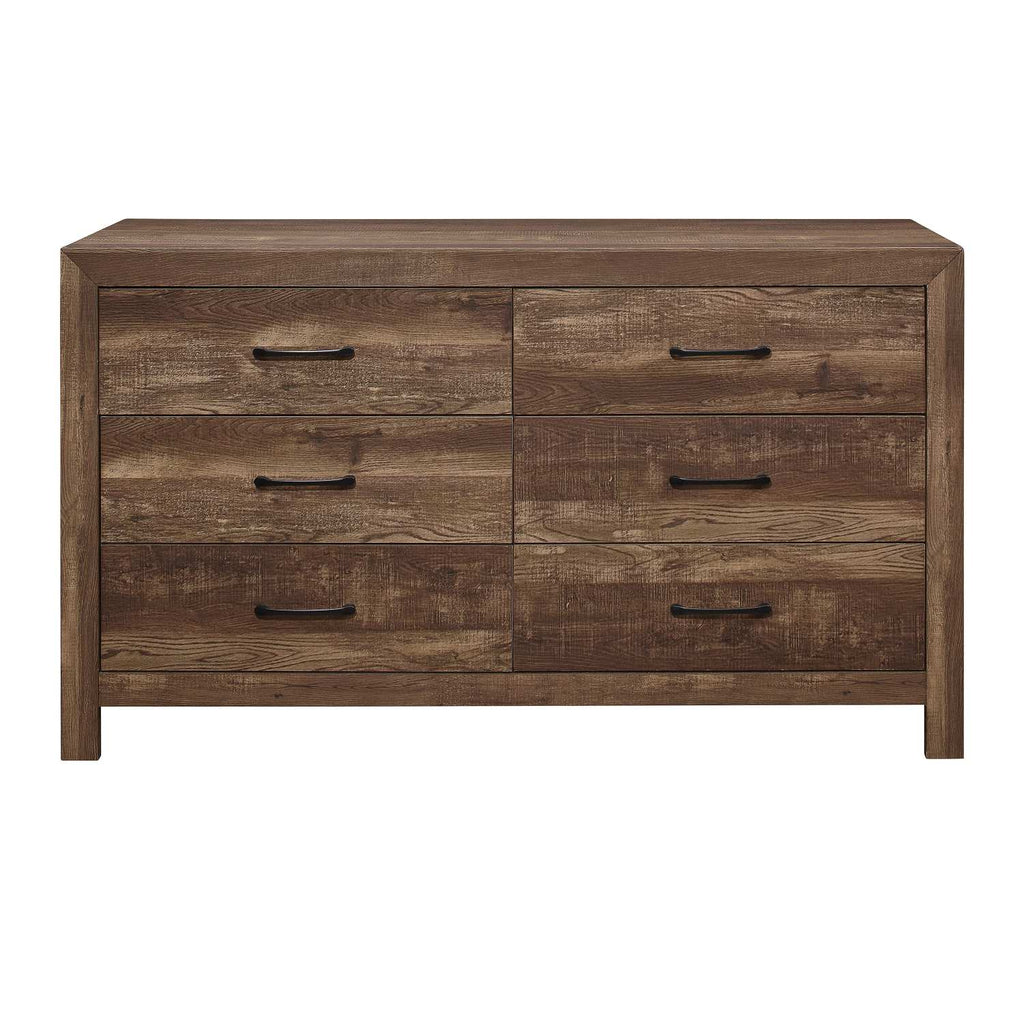 Modern lines and rustic styling are paired to create the look of the Corbin Collection. The 3D printed paper veneer’s texture is highlighted by a brown finish for a realistic wood look. Providing complementing contrast, the drawer fronts of the dresser feature black metal hardware. Subtle framing defines the profile of the dresser, further lending to the unfettered design of the collection.
