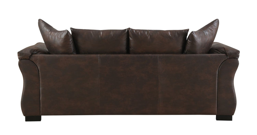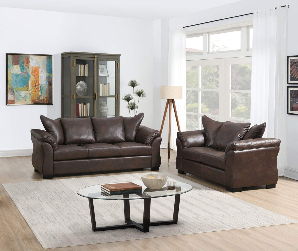 If you are the type of person who loves to sink into a pile of pillows, the Corso Collection was designed for you. This elegant 3-piece set takes a transitional modern profile and wraps it in velvety soft polished microfiber upholstery in a warm brown hue. The low frame is cushioned by a pillow-style back formed of large pillows that are both removable and fully reversible, making them easier to plump up and to clean. The curving flared arms are also bolstered with pillow-style arms for padded softness that just won’t quit. Crafted with sturdy wood framing, superior seat construction, and exposed wooden legs in a dark finish, this set is designed to be a long-lasting staple in your living room. Whether your kids are building pillow forts or you are lounging solo in a cloud of comfort, the Corso is ready for you.