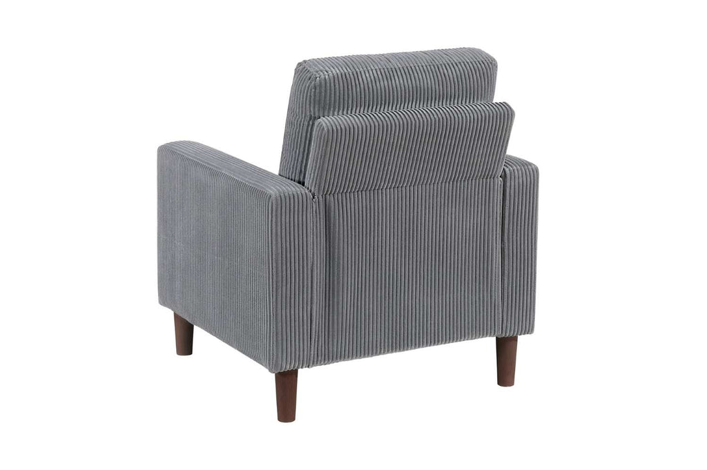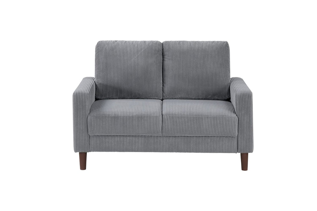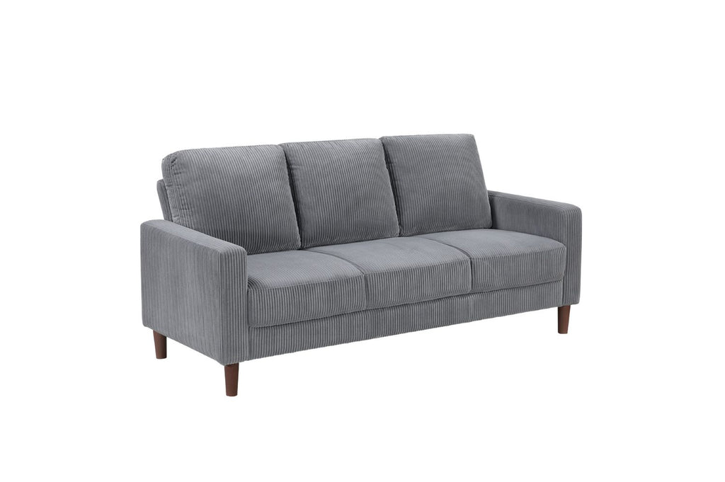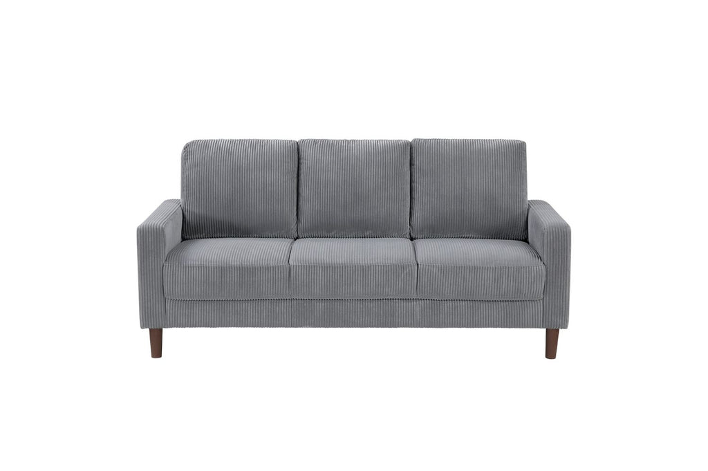 This collection offers a range of cozy, sophisticated seating options, including a side chair, loveseat, and sofa, all featuring soft, textured gray corduroy upholstery. The clean, modern silhouette is complemented by sturdy brown faux wood finish legs, adding natural elegance to each piece. The generously cushioned seats and backs ensure exceptional comfort, perfect for relaxing, reading, or entertaining. The side chair is great for smaller spaces, while the loveseat and 3-seater sofa provide ample seating for living rooms, apartments, or family rooms. These versatile pieces complement various décor styles, creating an inviting and stylish atmosphere in any room.