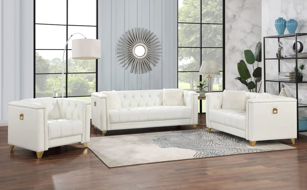 Elevate your living space with this Cream Faux Leather 3-piece Sofa Set featuring elegant gold legs. Designed for both comfort and style, the set offers a refined aesthetic with its smooth, cream-toned upholstery that complements any décor. The gold-accented legs add a touch of sophistication, making it a timeless centerpiece for your home. Durable and easy to maintain, this set combines luxury and practicality effortlessly.