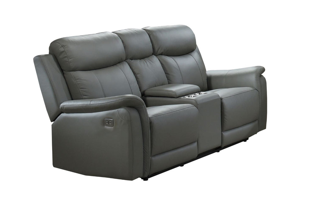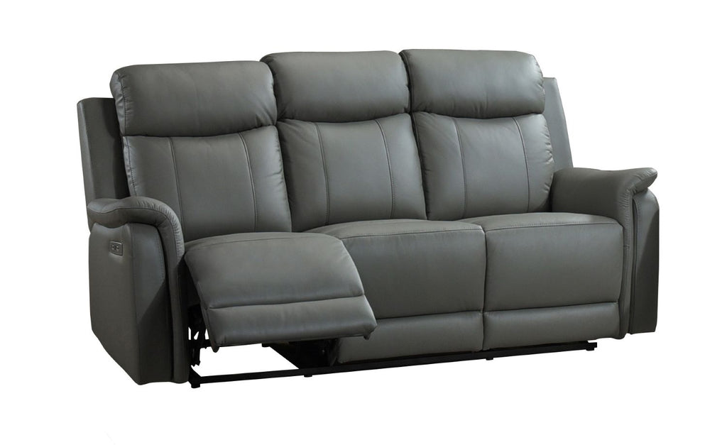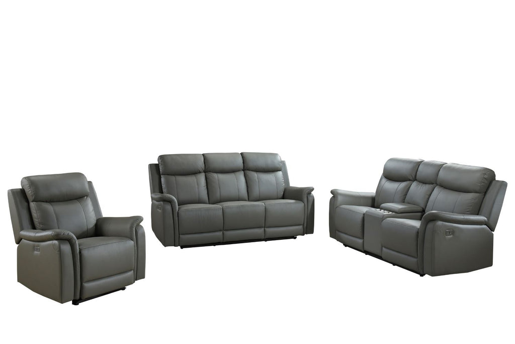 The classic look and evident comfort of the Cyrus reclining collection makes it a no-brainer for your contemporary living room. This 3-piece set features dual side-mounted control buttons that adjust the power footrests for the ultimate flexibility of comfort positioning that is sure to please everyone in your household. The seat fronts are covered in authentic cowhide leather upholstery on every surface that touches your skin, while cost-effective high quality PVC-match fabric finishes off the sides and back, all in a handsome grey colour. Stitch detailing offers subtle visual interest for a tailored appearance just as padded pillowy arms, generously stuffed headrests, and comfortable no-sag seat construction cradle your body supportively. With the addition of console interior storage and cupholders, the Cyrus truly is the perfect marriage of modern functionality and timeless style. Also available with non-power reclining options; other colours also available.