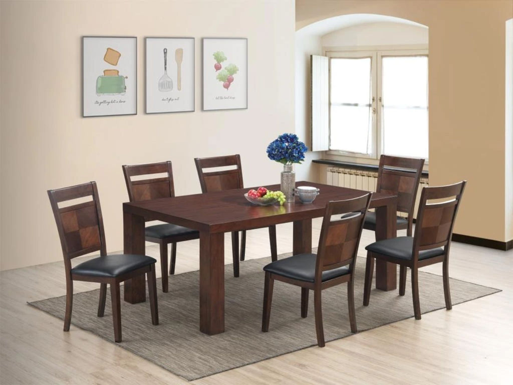 Elevate your dining space with this elegant 7-piece dining set, featuring a sleek table and six comfortable chairs. Crafted with smooth wooden surfaces enhanced by mango veneers and a rich dark walnut finish, it brings a contemporary yet warm ambiance to any gathering. The fabric-padded seats and stylish backrests combine comfort with refined design, making this set an inviting centerpiece for memorable dinner parties.