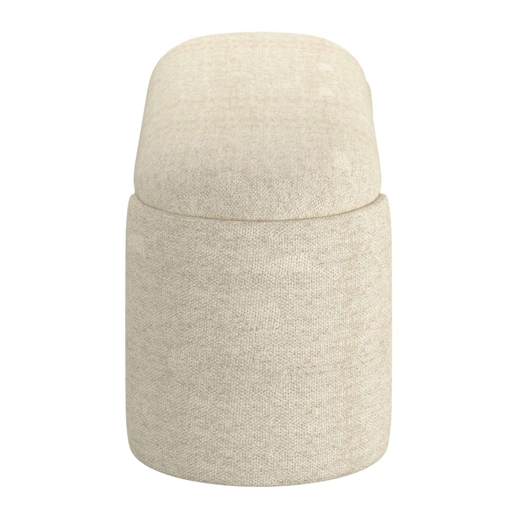The Dephne Storage Ottoman in Beige offers elegant, oval-shaped design with soft textured fabric upholstery, enhancing any modern living space. It features a deep storage compartment with safety-stop hinges for secure and convenient access. The medium comfort polyester foam cushion provides comfortable seating, while the sturdy construction supports up to 300 lbs, blending style with practical function seamlessly.