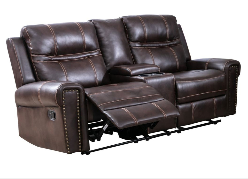 Stylish appeal combines with contemporary comfort to bring you the Emerson collection. Generously stuffed with plump back cushions to offer all the lumbar support you could want, this handsome loveseat is upholstered in supple brown leather gel, presenting your living room with a luxurious look and feel. Double tab-pull latches give you the option to stretch out and recline at either end, and combined with coil seat construction padded with high density foam, you may never want to get up again. The central console features lift-top storage and metal cupholders for additional convenience. Eyecatching details such as double stitch patterning and brass nailhead trim along the armrests ensures the Emerson is not only functional but retains its status as a handsome anchor for your contemporary living room décor. Also available in black leather gel.