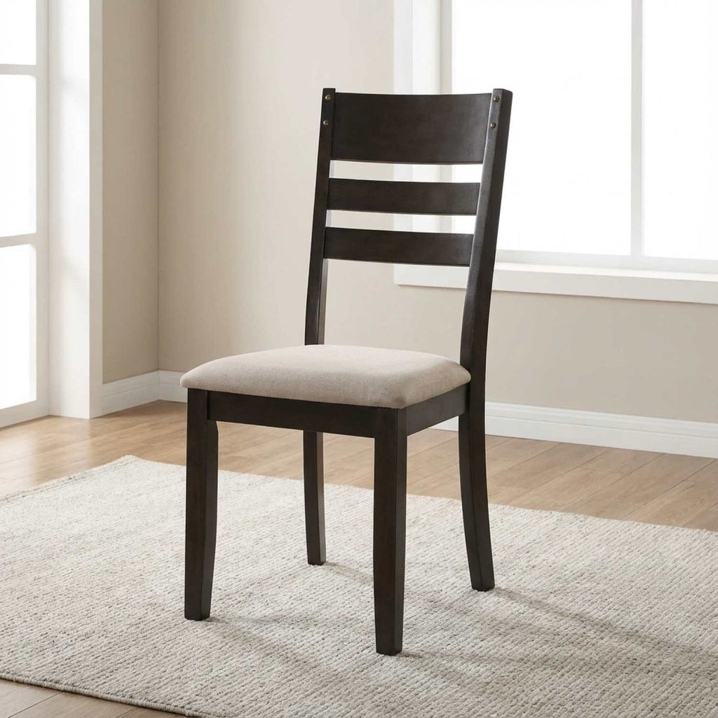 This Dining Collection is perfect for any home. Featuring a table with a storage shelf and ladder back chairs with metal nailhead trim, it is constructed from exotic wood and wood veneers in an espresso finish. Its creme upholstered cushion fabric seats complete the look.
