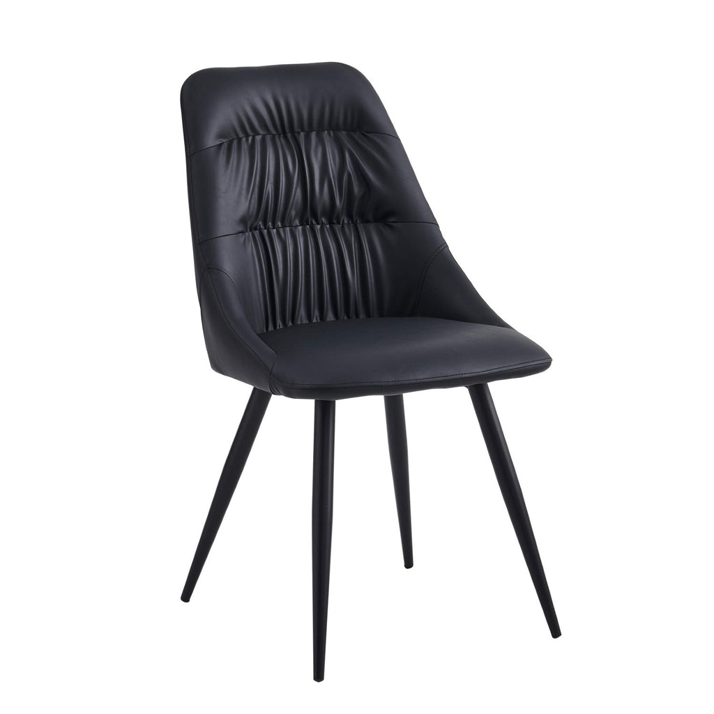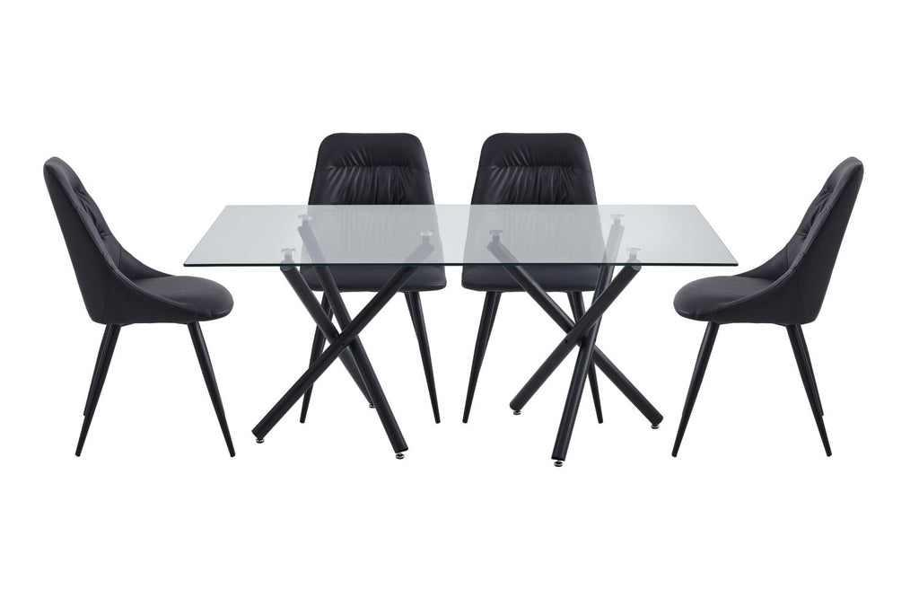 The Fannia-Tomaso Collection is a stellar way to modernize your dining area thanks to its trendy profile and upscale look. This stylish dining table is crowned by a perfectly clear glass top that floats above a double pedestal base comprised of artfully intersecting metal tubes in a matte black finish for an aesthetic that is both avant-garde and industrial-chic. The glass tabletop has been tempered to increase its durability and resistance to shattering, and its clarity provides an unfettered feel that helps give any space the impression of being open and bright. Accompanied by coordinating chairs with a sleek silhouette, trendy black faux leather upholstery, and tailored ruched accenting, this set beautifully amalgamates a sculptural appearance with functionality to comfortably seat four people. The Fannia table with Tomaso chairs has just the right amount of personality to make a statement in your dining room but is understated enough to suit the rest of your contemporary décor.
