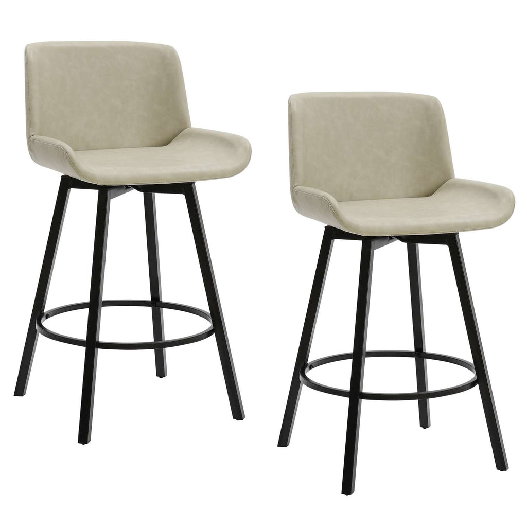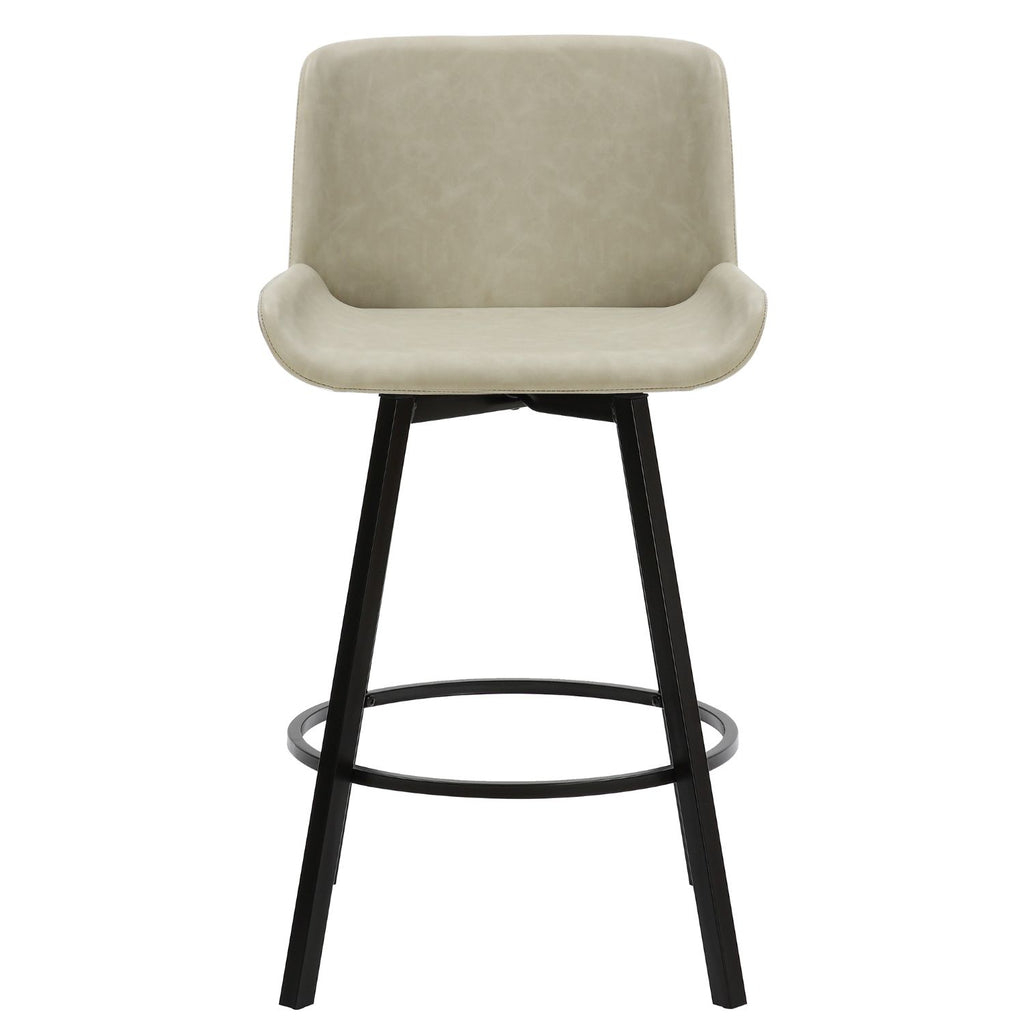Elevate your kitchen or bar area with the Fern 26" Ivory Swivel Counter Stools. Featuring 360° swivel seats upholstered in vintage ivory faux leather, these stools offer both style and versatility. The wide contoured seating with medium comfort polyester foam cushions ensures lasting comfort, while the sturdy square tube black metal legs and integrated footrest provide stability and support. This set of two blends timeless design and functional elegance for a refined seating experience.