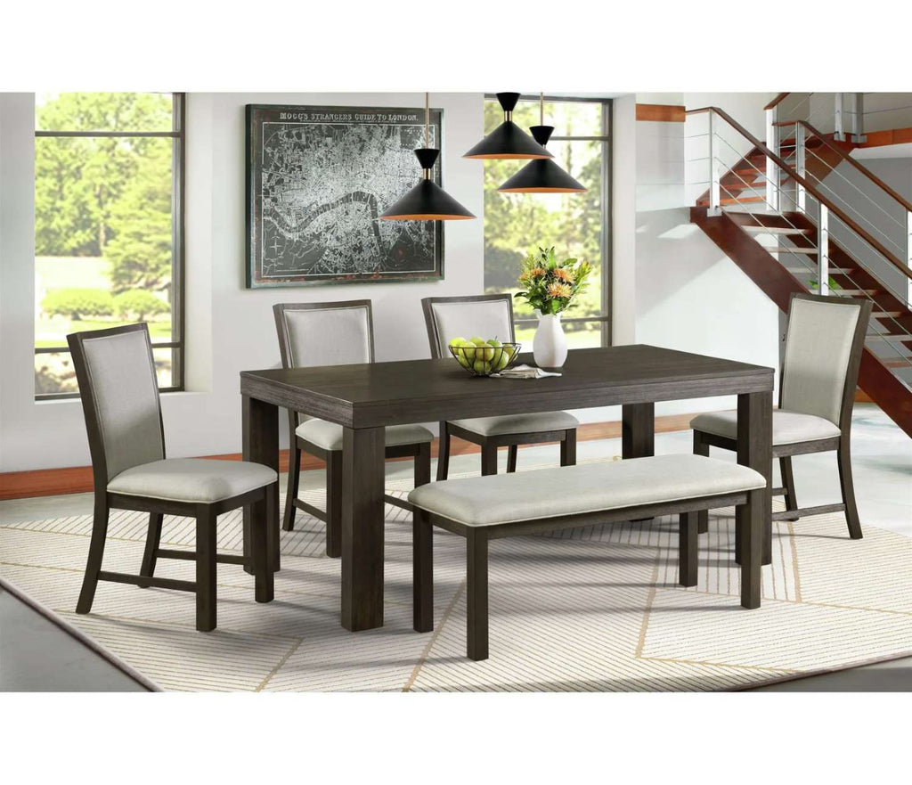 Elevate your dining area with the Grady 6pc Wooden Dining Set in dark brown. Featuring robust table legs and a refined finish, this set offers a sophisticated yet welcoming presence. The upholstered chairs with memory foam cushions and taupe fabric provide exceptional comfort, making every meal a relaxing experience. Its versatile transitional design harmonizes seamlessly with various decor styles, enhancing your home’s elegance and functionality.