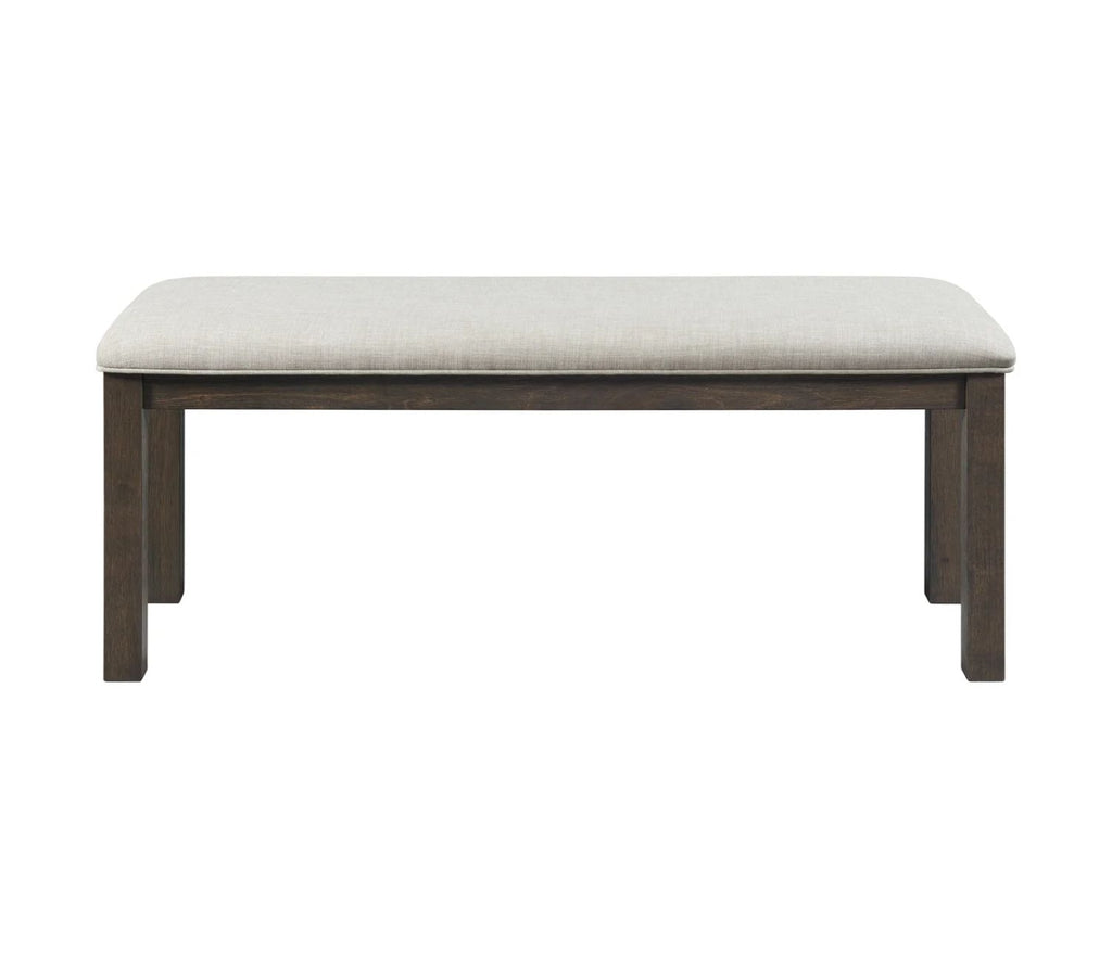 - Taupe upholstery on chairs and bench