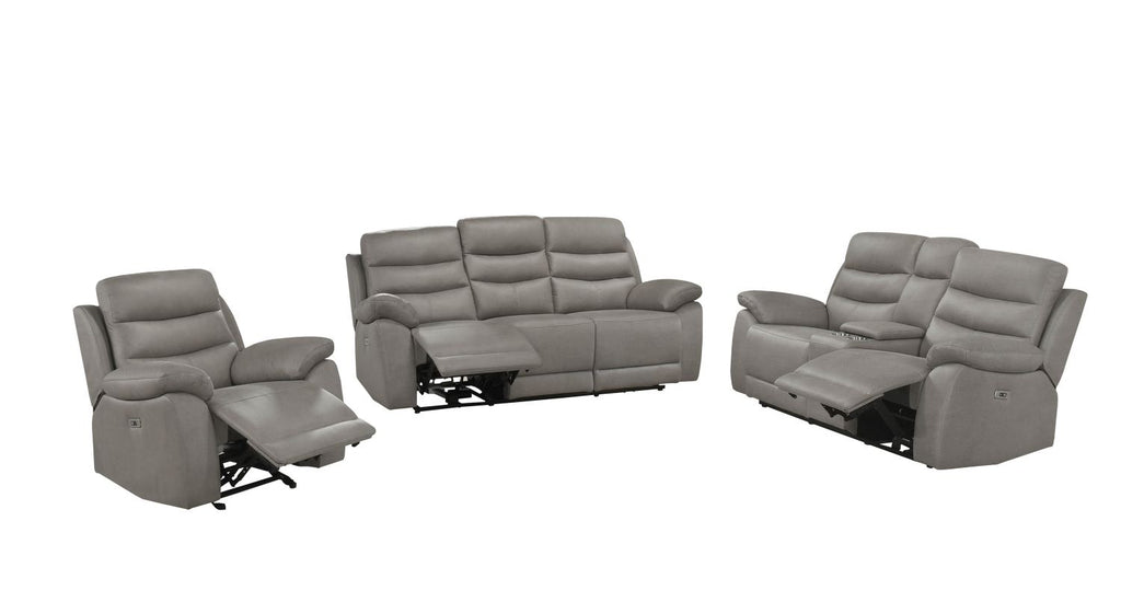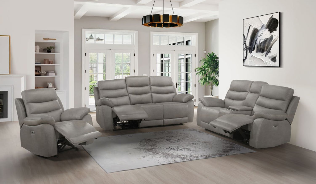 Sit back, relax, and let the Hammond 3-piece Power Reclining Upholstery Set take the lead for comfort. This sofa collection combines plush support with smooth movement and customizable reclining positions, giving you complete control over how you unwind. Upholstered in a soft polished microfiber in slate grey, this set brings a contemporary cozy look to your space while delivering full body comfort at the push of a button. Generously padded headrests and articulated back cushions combined with plump pillow-style arms cradle you from every angle, while dual power reclining seats extend effortlessly to bring you into lounging mode. Convenient extras include the USB charging ports integrated into the power controls, the loveseat’s practical central console with interior storage and cupholders, and the soothing back-and-forth motion accorded by the recliner’s glider mechanism. Whether it’s for movie nights or general relaxation, the Hammond delivers uncomplicated comfort that’s a joy to sink into.