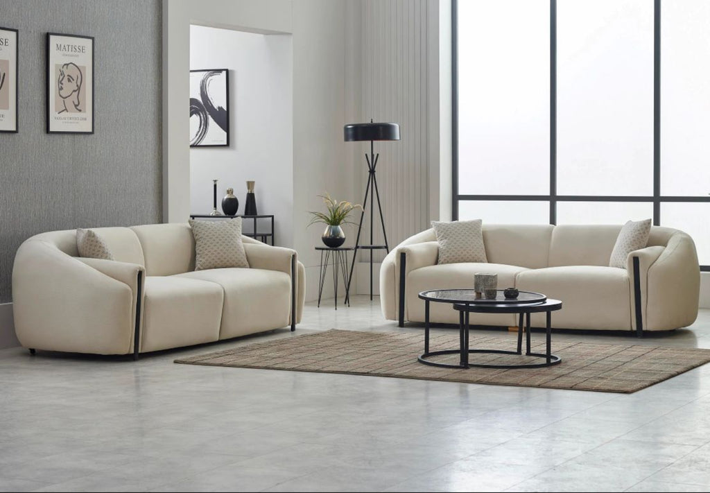 The Heaven Sofa merges contemporary elegance with everyday comfort. Wrapped in soft ivory fabric, it features generously cushioned seating throughout and distinctive rounded armrests finished with sleek black metal accents. This refined piece balances modern design sensibilities with inviting proportions, making it an ideal focal point for living spaces that value both style and relaxation.