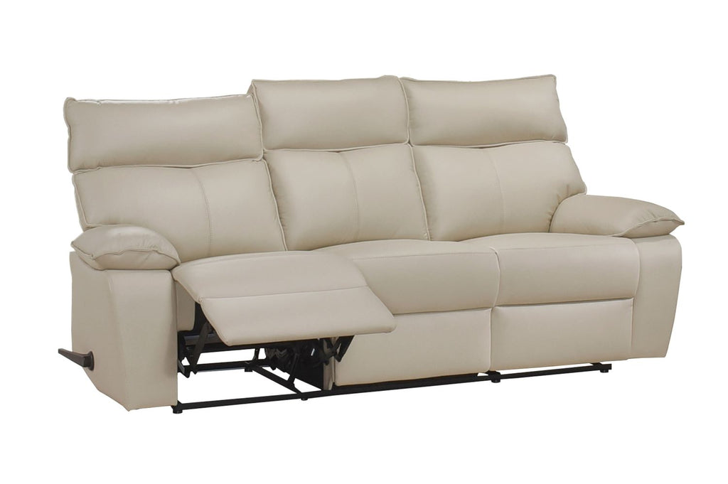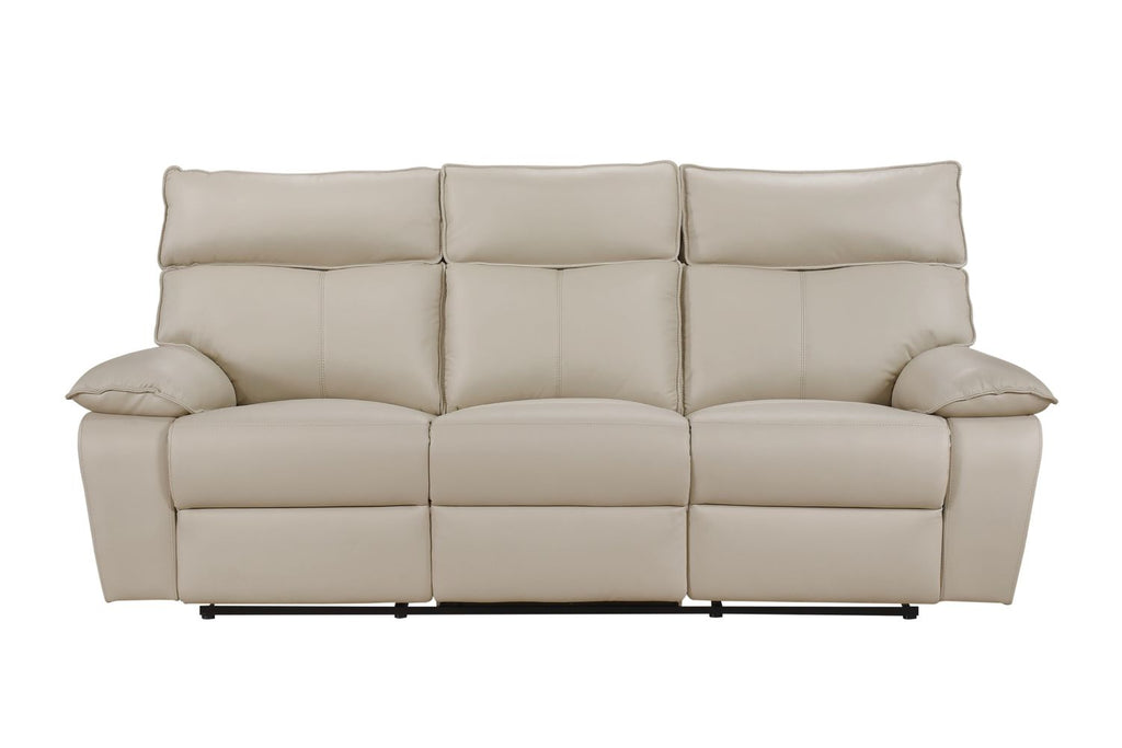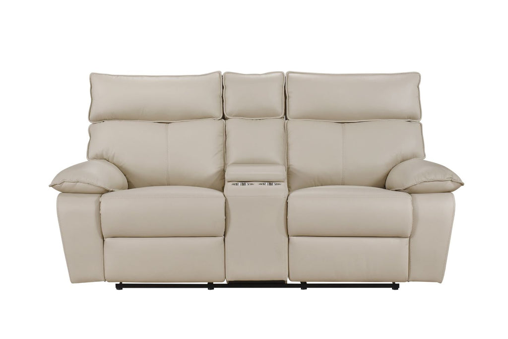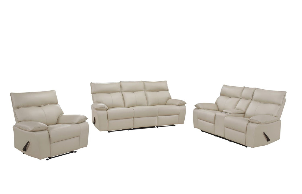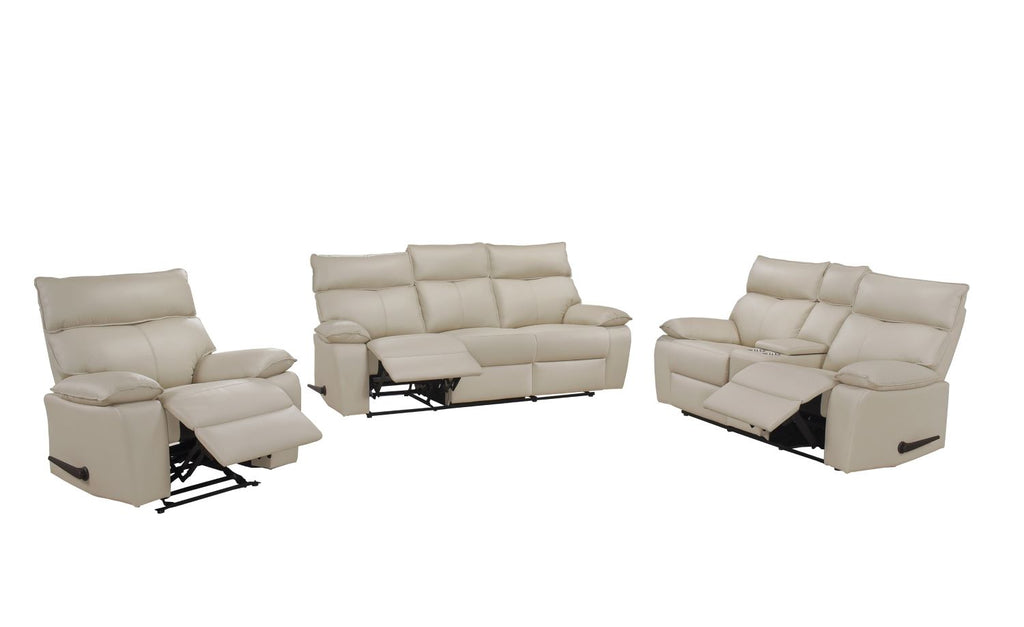 Welcome to comfort that moves with you with the Kandra Reclining Upholstery Set. Whether you’re kicking back after a long day or settling in for movie night, this collection is designed to bring personalized relaxation into every corner of your living room. Beautifully appointed with piped seam edges for a tailored look, decadent beige top grain leather greets you on all front surfaces that touch your skin with premium faux leather PVC-match on the sides and back. You are in for a treat as you sink into the generously padded cushions, especially with the plump headrests and pillowtop arms that were made for real lounging. Finally, the loveseat’s central storage console with built-in cupholders and the recliner’s gentle gliding function are icing on the cake to make this collection as functional as it is suave.