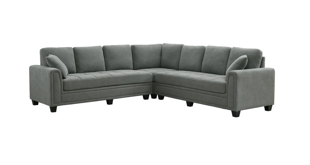 Designed to balance today’s trends with everyday comfort, the Kelsier Collection brings elevated function into focus. This 3-piece corner sectional features soft textured grey chenille upholstery with a contemporary profile and subtle biscuit-tufted seats, offering understated style and structure in one striking silhouette. Built for connection and comfort, the configuration features symmetrical left and righthand loveseats that sandwich a corner seat, making room for everyone without overwhelming your space. Two square coordinating toss pillows add auxillary lumbar support sfor your convenience. With plush cushioning, tailored lines, and durable construction, the Kelsier isn’t only built to impress, but also to last.