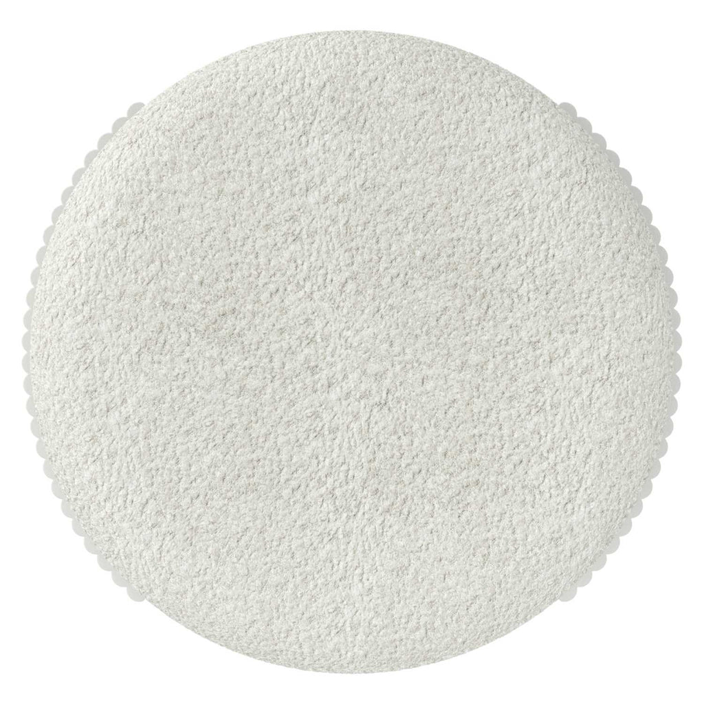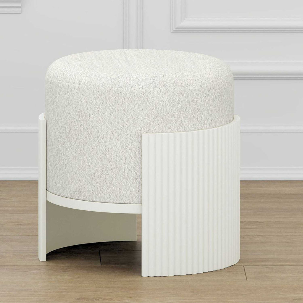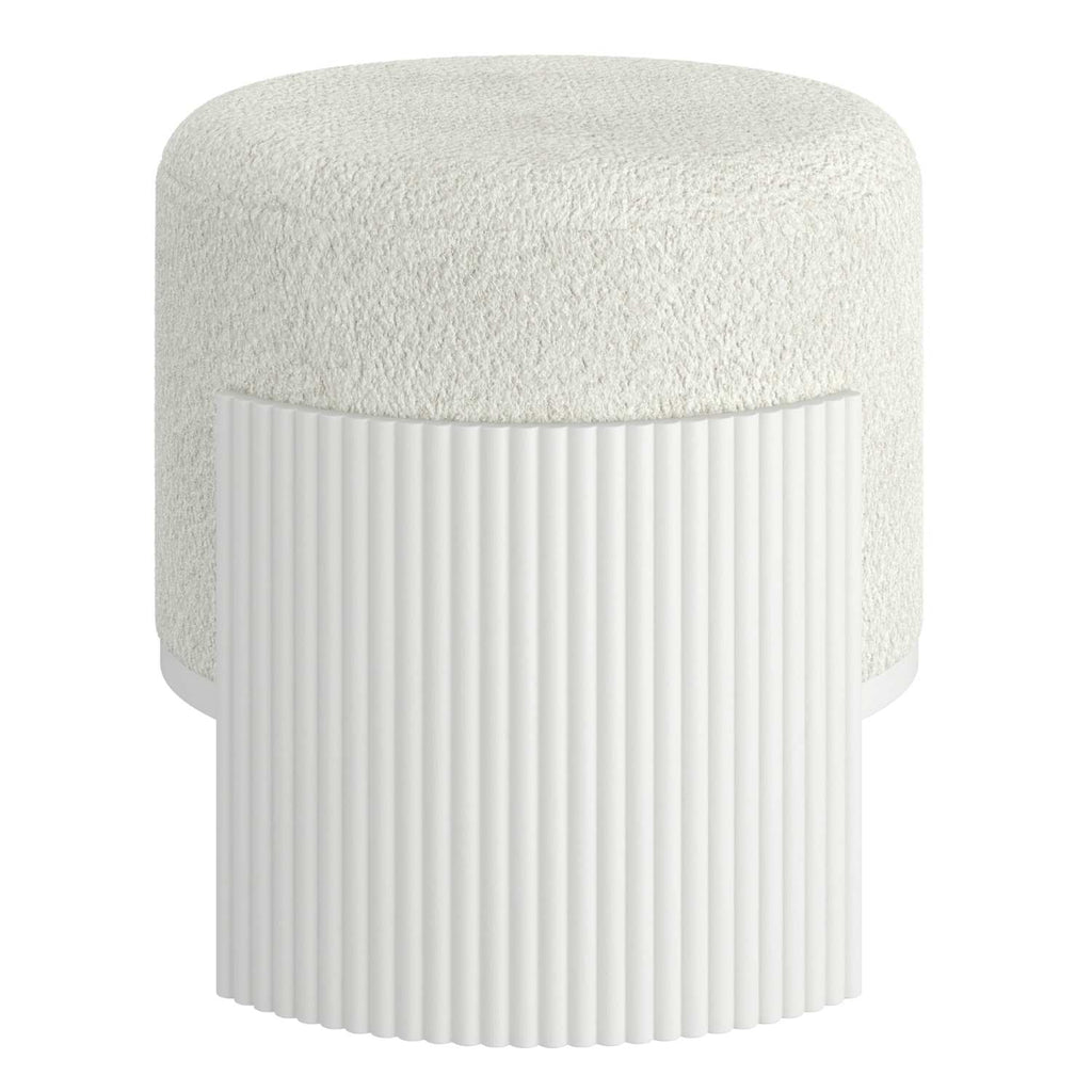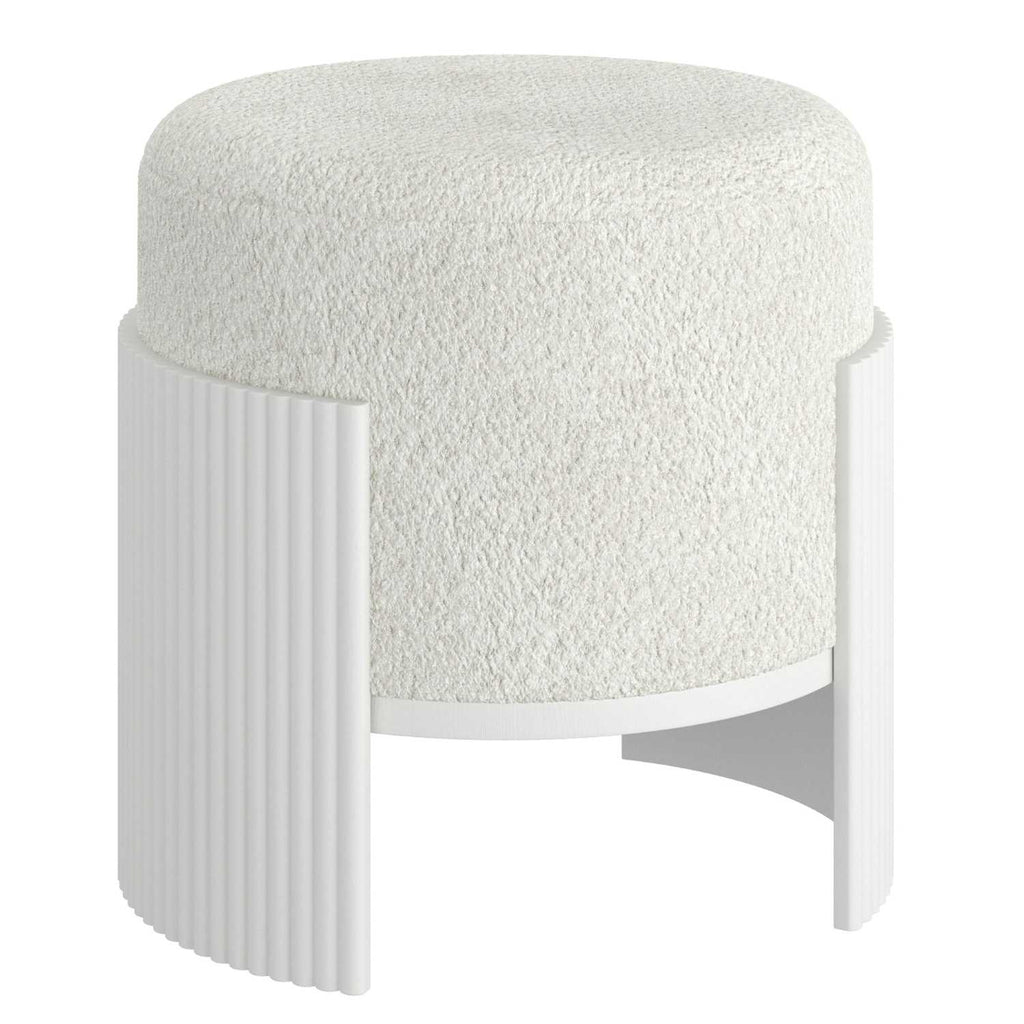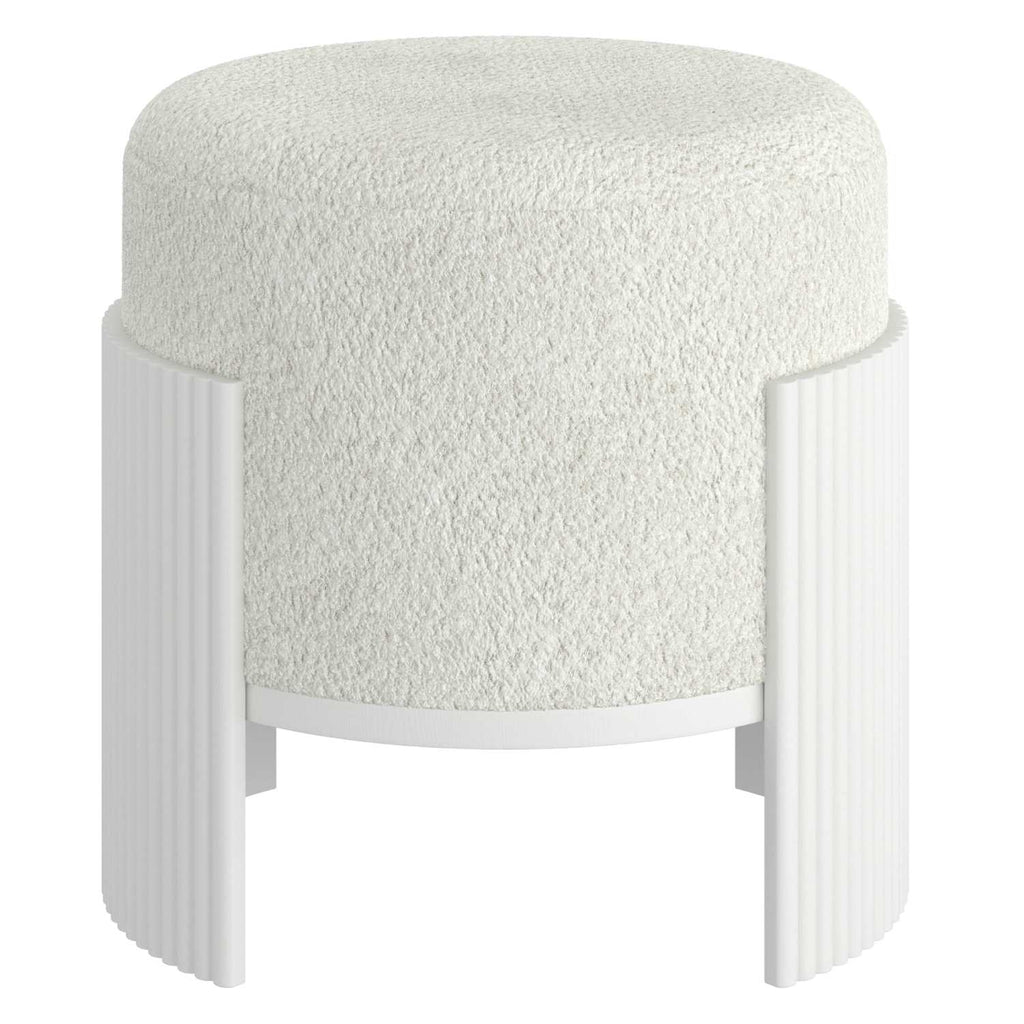Elevate your living space with the Kiraz Round Ottoman, featuring elegant ivory boucle fabric upholstery that offers a soft yet durable touch. Its reeded engineered wood frame in a refined white finish adds a subtle architectural detail, blending modern design with timeless appeal. The medium-firm polyester foam cushion provides comfortable support, making it a versatile piece for seating or relaxing. Designed to hold up to 200 lbs, this ottoman combines style and function for a sophisticated statement in any room.