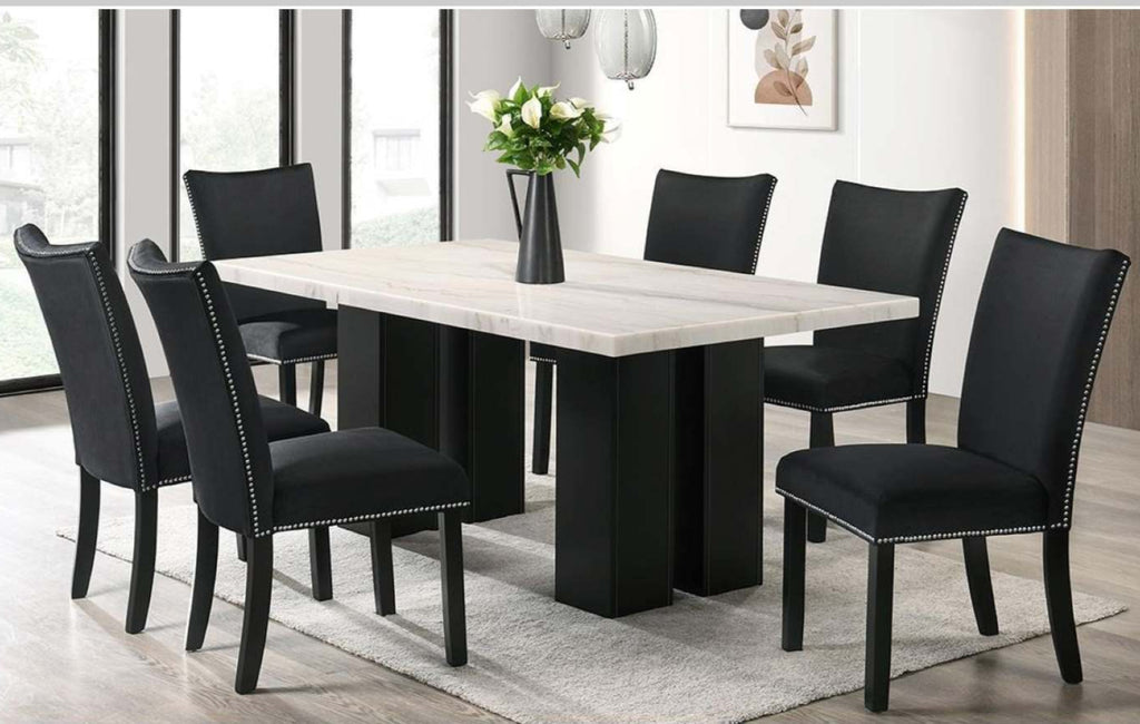Featuring solid wood legs and 70" sturdy White Marble table top, this modern dining set is sure to accommodate all your dining needs. Velvet fabric dining chairs with chrome nailheads are both classy and elegant!