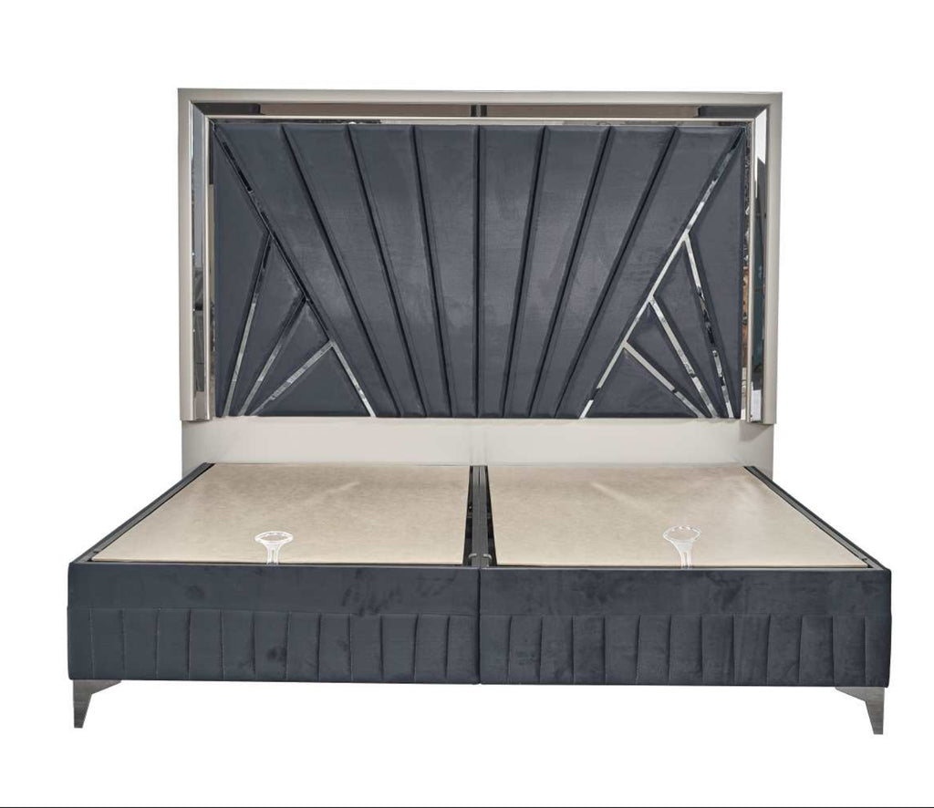 Elevate your bedroom with this luxurious bedroom set, available in both 4 and 5 -piece configuration. The centerpiece of the set is a beautifully crafted bed with a modern geometric headboard, upholstered in plush velvet fabric, and featuring integrated LED lighting. The bed includes a hydraulic lift gas platform for convenient under-bed storage, perfect for keeping extra linens and accessories neatly tucked away. The set also includes a spacious dresser and a stylish nightstand, both featuring a high gloss lacquer finish and diamond-shaped drawer fronts for added elegance. A sleek beveled mirror with LED accents completes the set.