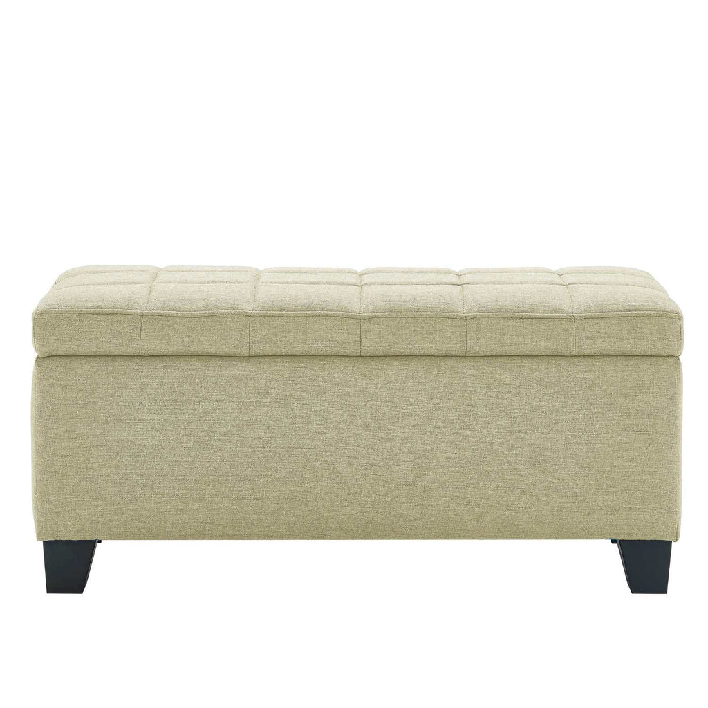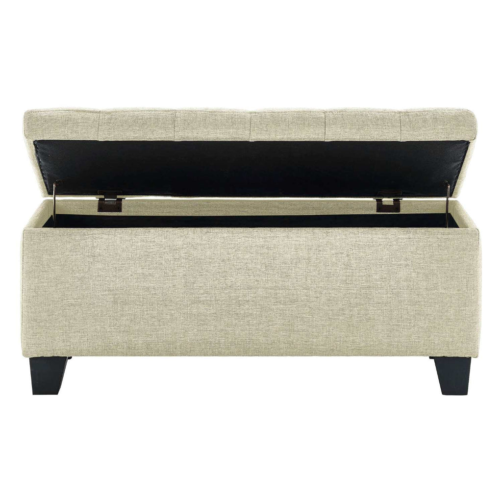 The Lila Rectangular Storage Ottoman in Beige combines modern design with practical functionality. Featuring textured fabric upholstery and a square tufted top, it offers refined style with medium-firm polyester foam cushioning for comfortable seating. Its deep storage compartment is secured with safety stop hinges to prevent sudden closures, providing both convenience and safety. Supporting up to 300 lbs, this elegant piece enhances any living space with subtle sophistication and smart storage.