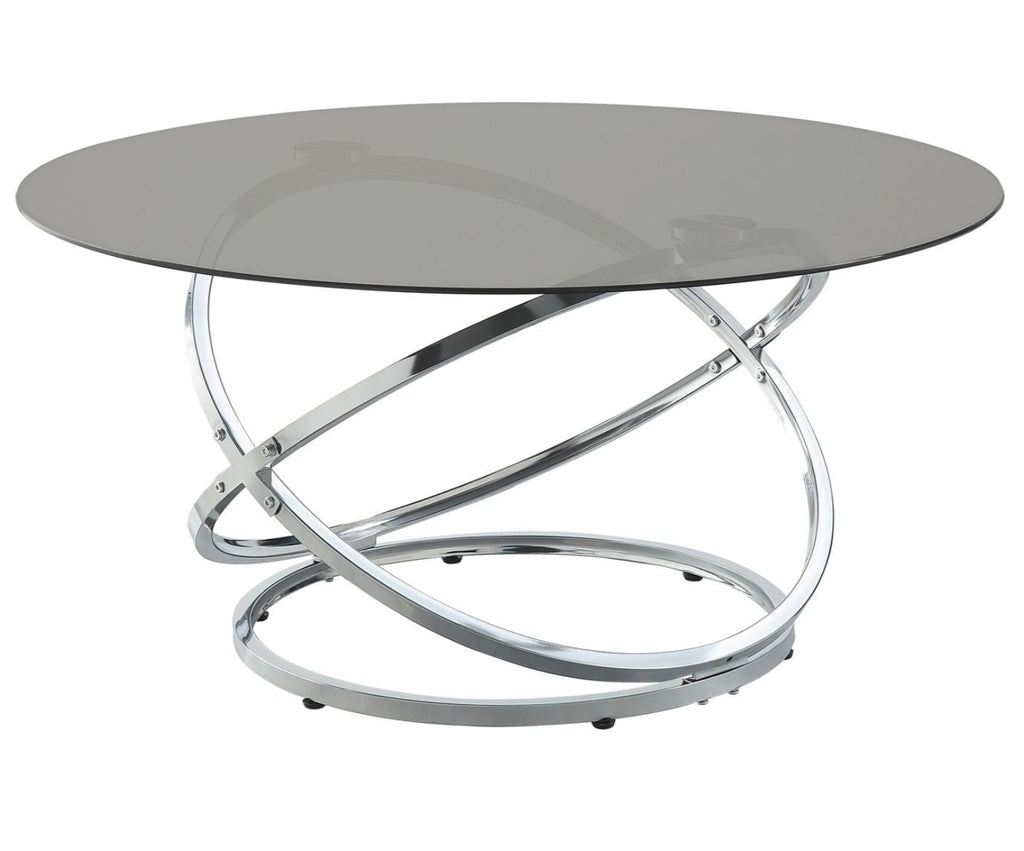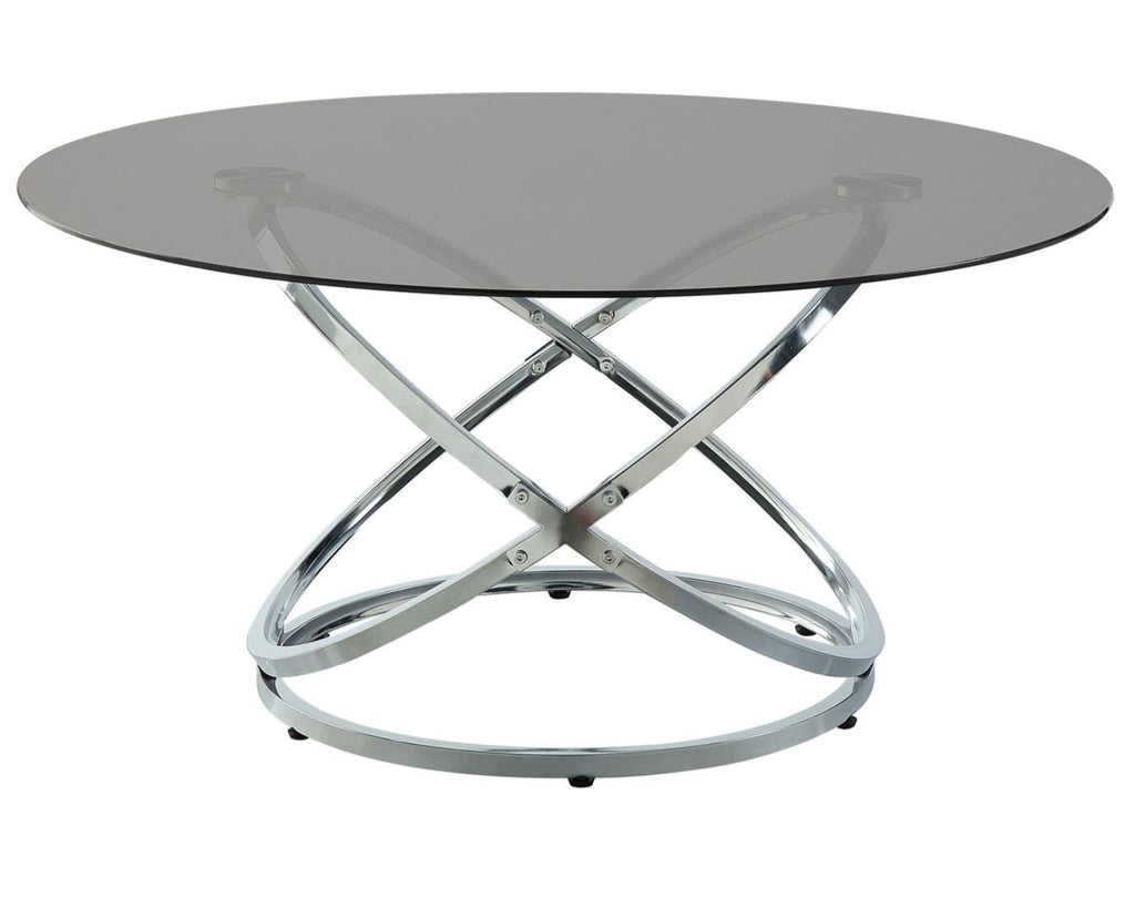 Utterly modern with a distinctive metropolitan vibe, the Marion Collection was designed to turn heads. Making use of negative space and rounded forms, this coffee table achieves a unique sculptural look thanks to a pedestal base comprised of open interlocking metal circles in a highly polished chrome finish, on top of which rests a round smoky grey glass tabletop. The top has been tempered to make it stronger and more durable than regular glass, which also allows it to be safer and less prone to shattering. The translucent table surface and open framing makes the Marion feel light and airy in your living room, granting the room a sense of effortless modern style.