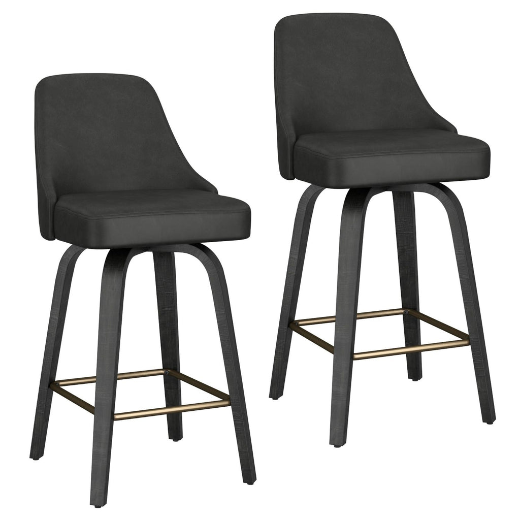 Elevate your kitchen or bar area with the Oakley 26" Charcoal Swivel Counter Stool Set. Featuring a 360° swivel seat for effortless movement, each stool combines solid black-finished wood legs with an aged gold footrest for a refined look. The oversized seat showcases vintage charcoal faux leather upholstery, complemented by a medium-density polyester foam cushion that balances style and comfort. Perfectly designed for both function and elegance.