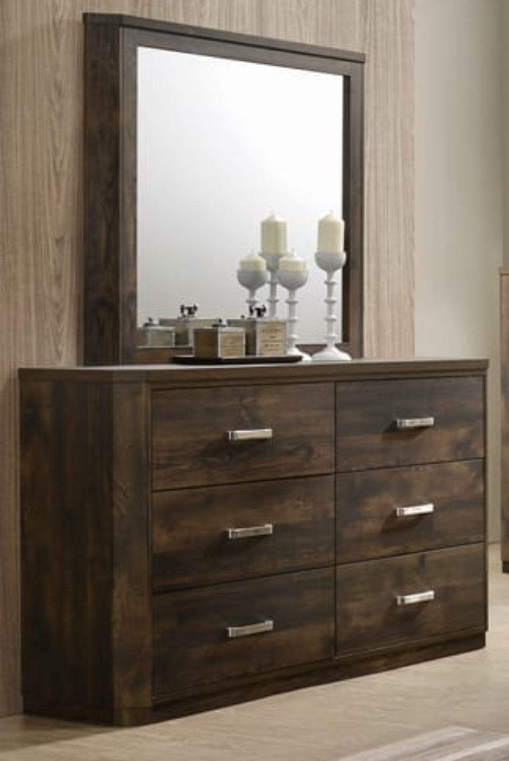 Elevate your bedroom with the Olivia Wooden 6 Drawer Dresser & Mirror in a rich deep walnut finish. Crafted from wood veneer, this piece features a distressed look that adds timeless character. Its beveled corners and sleek chrome pulls combine classic elegance with modern sophistication, offering ample storage while enhancing your space with refined style.