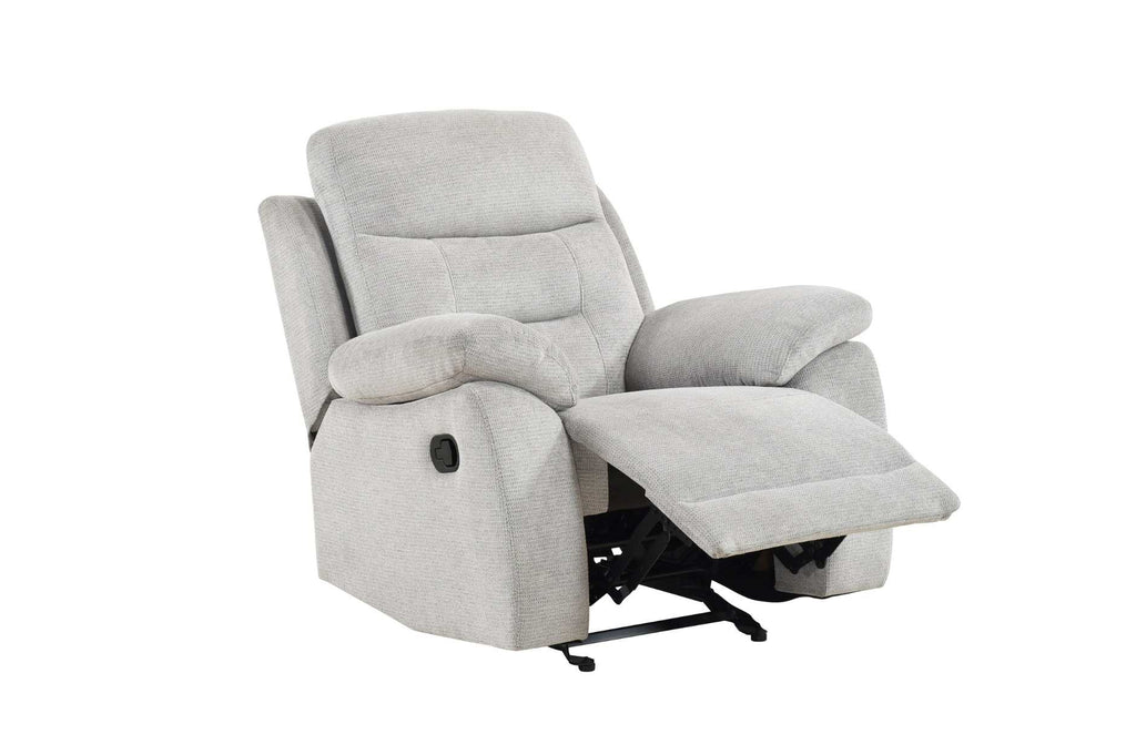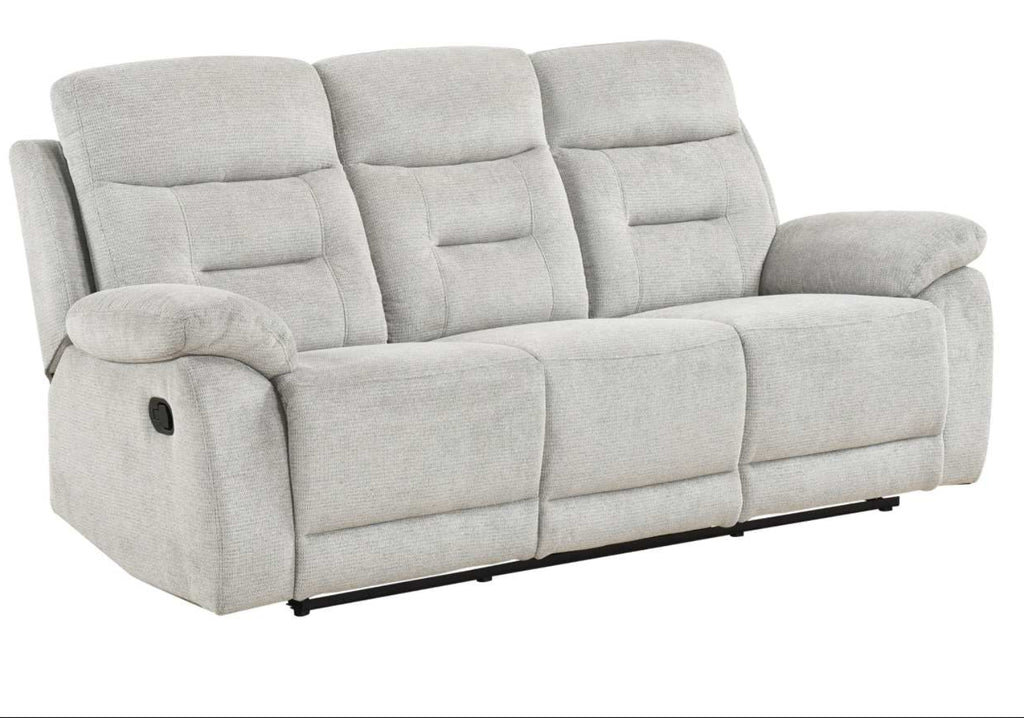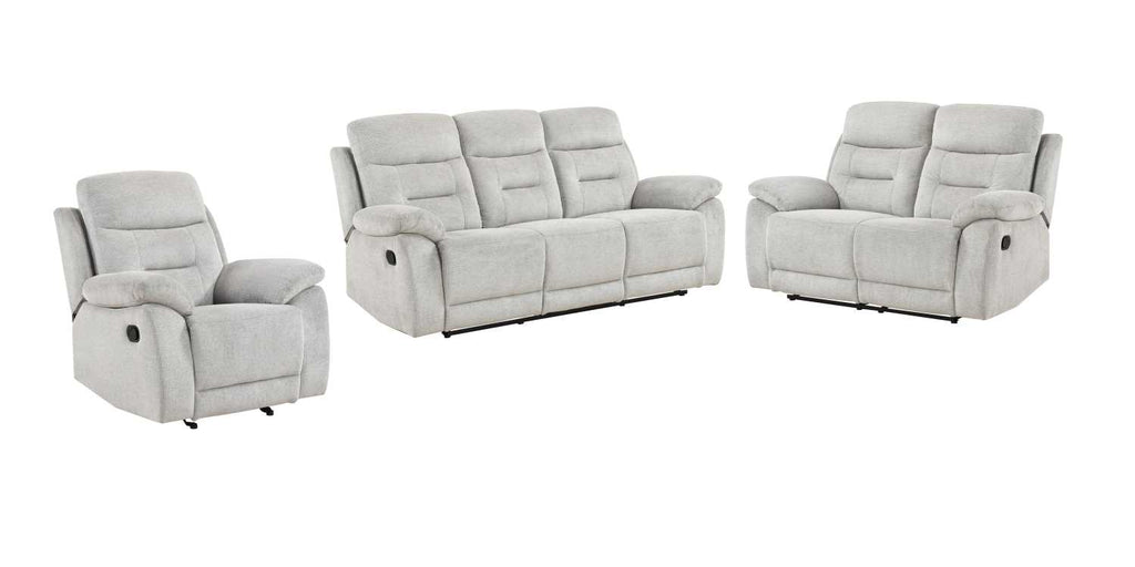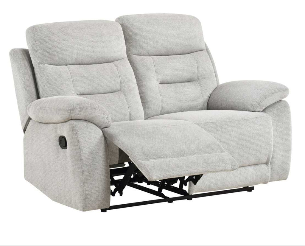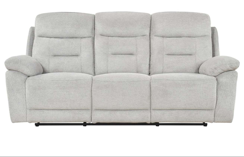 Made for the moments that matter, the Perris Collection brings total comfort within easy reach. Wrapped in a soft textured fabric in a subtle shade of beige, this collection offers a contemporary look with just the right amount of plush cushioning. From the generously padded pillow-style arms to the dimpled back cushions, plump headrests, and padded seat construction, every detail is designed to support and bolster you in all the right places. Enjoy the gentle back-and-forth motion of the recliner's glider mechanism, and when you're ready to relax, pull on the side-mounted tab-latch mechanisms of each seat to instantly recline! Whether you're winding down with a movie or catching up with family, the inviting cushions and homey design make the Perris your go-to spot for everyday lounging.