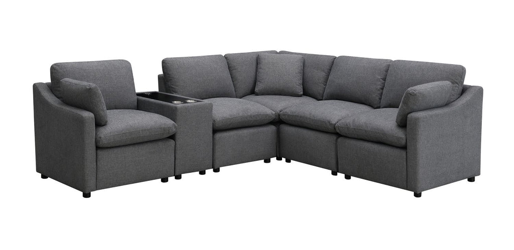 - Includes 6 pieces: LSF Arm Chair (L) + Console (CN) + 2x Armless Chairs (AC) + Corner/Wedge Chair (CR) + RSF Arm Chair (R)