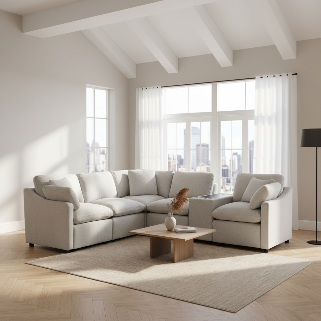 The Pippa Collection offers endless opportunities to reinvigorate it thanks to its stylish modular design. This 6-piece set features a left side arm chair, a console, two armless chairs, a corner seat, and a right side arm chair, allowing you to create the perfect seating arrangement for any occasion. Whether you prefer a spacious corner sectional for entertaining or a cozy loveseat for relaxation, the Pippa has you covered. Wrapped in sumptuous textured light grey chenille fabric and accented with three coordinating lumbar pillows, the neutral palette and clean lines of the design adds a touch of modern sophistication to any space. With fully removable and reversible back and seat cushions plus removable cushion covers, maintenance is a breeze, ensuring your sectional’s appearance stays fresh and inviting. Moreover, the console’s convenient cupholders and wireless charger coupled with the blend of high density foam and super soft feather down blend filling guarantees superior comfort for lounging in style.