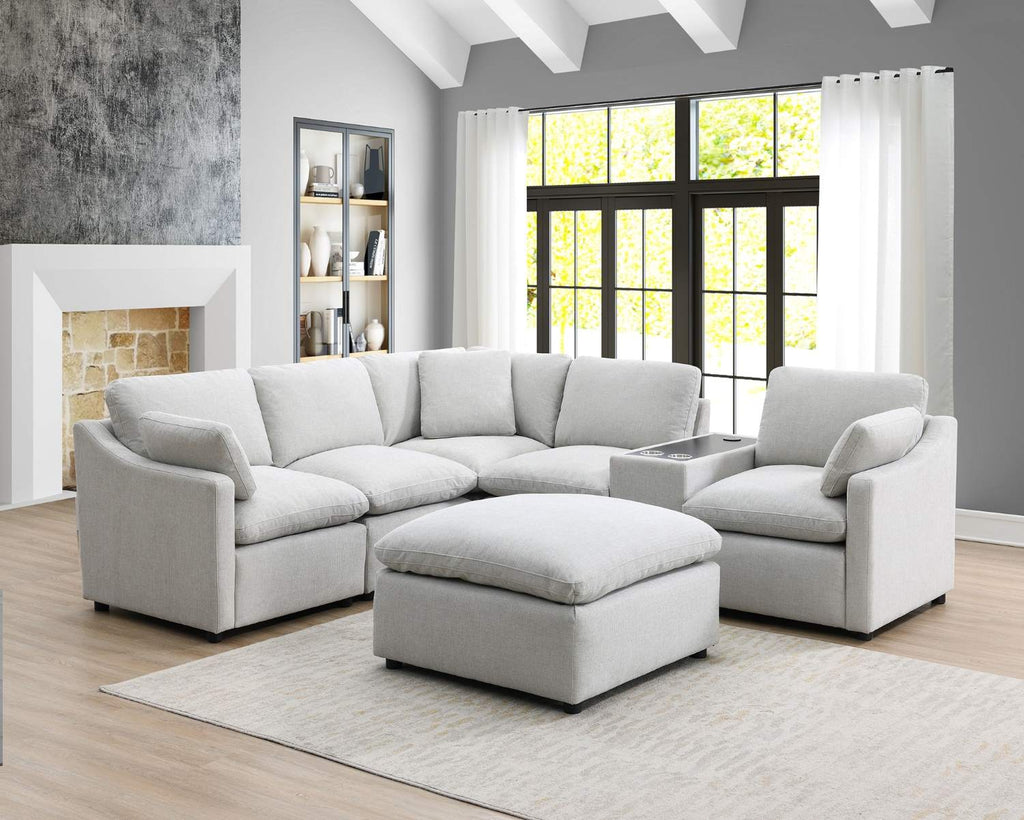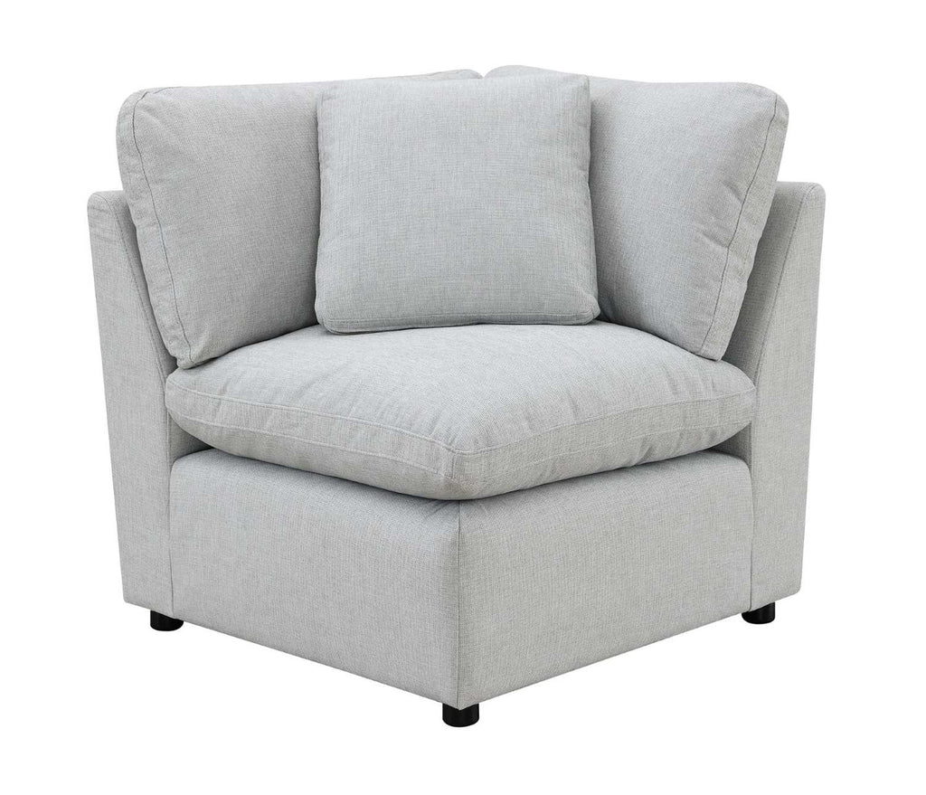 The Pippa Collection offers endless opportunities to reinvigorate it thanks to its stylish modular design. This 7-piece set features a left side arm chair, a console, two armless chairs, a corner seat, a right side arm chair, and a large ottoman, allowing you to create the perfect seating arrangement for any occasion. Whether you prefer a spacious corner sectional for entertaining or a cozy loveseat with ottoman chaise for relaxation, the Pippa has you covered. Wrapped in sumptuous textured light grey chenille fabric and accented with three coordinating lumbar pillows, the neutral palette and clean lines of the design adds a touch of modern sophistication to any space. With fully removable and reversible back and seat cushions plus removable cushion covers, maintenance is a breeze, ensuring your sectional’s appearance stays fresh and inviting. Moreover, the console’s convenient cupholders and wireless charger coupled with the blend of high density foam and super soft feather down blend filling guarantees superior comfort for lounging in style.