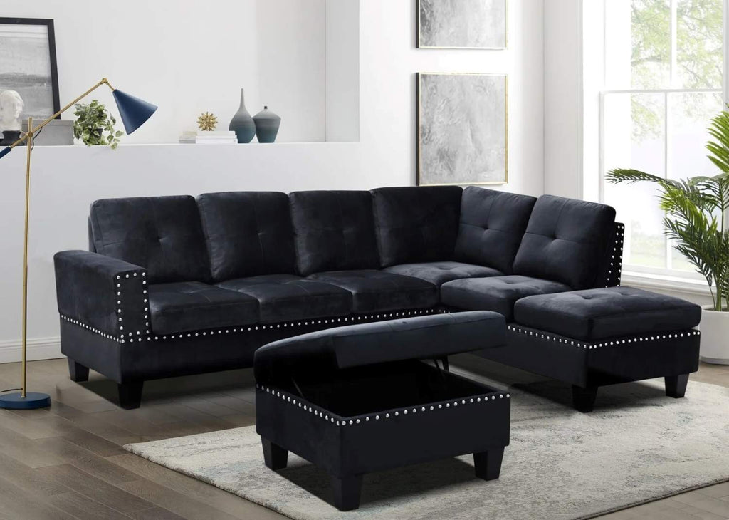 Experience refined comfort with this reversible black sectional sofa, designed to adapt seamlessly to your living space. The versatile chaise offers flexible seating arrangements, while the included storage ottoman provides discreet space to keep your living area tidy. Crafted for both style and practicality, this set enhances any interior with its elegant tone and thoughtful features.