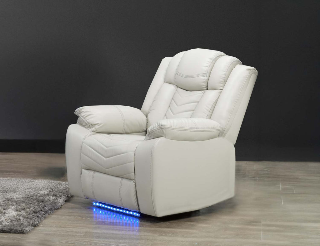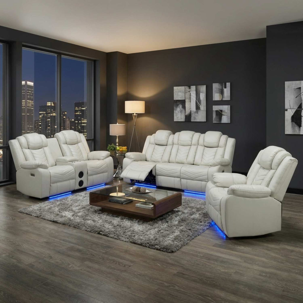 Bring home the ultimate blend of comfort, technology, and modern style with this luxurious 3-piece recliner set. Upholstered in supple leather-match fabric with contrast stitching, this collection is designed for those who want their living room to feel like a private theater. The spacious sofa and loveseat feature power recline functions, plush padded arms, and supportive headrests to keep you relaxed for hours. Built-in LED lighting at the base adds a sleek, contemporary vibe, while cupholders, storage consoles, USB charging ports, and Bluetooth speakers (on loveseat) keep convenience and entertainment at your fingertips.