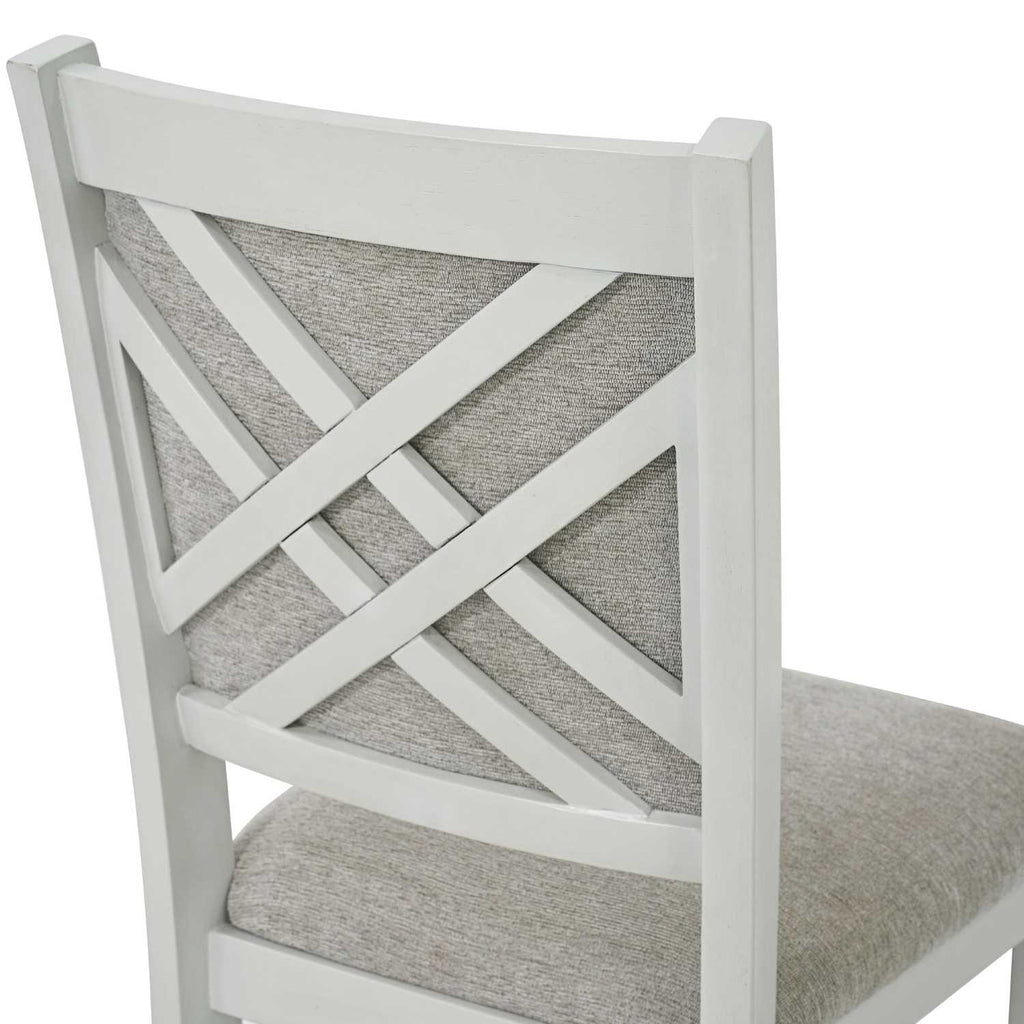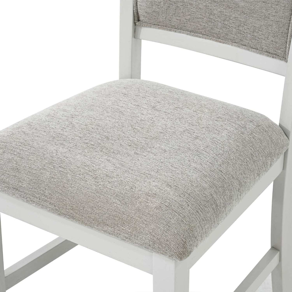 - Solid rubberwood chairs in a whitewash finish with textured, warm grey fabric upholstery