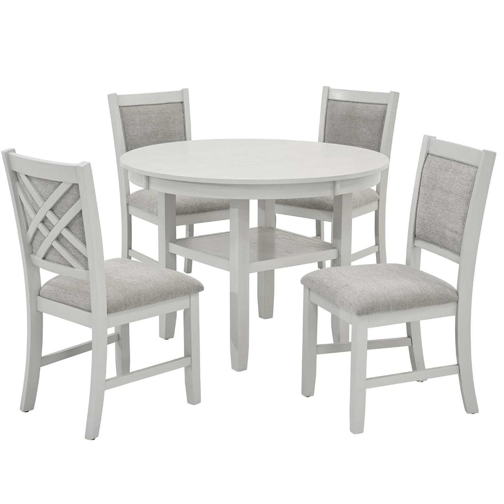 Elevate your dining space with the Samuel Wooden Round 5-piece Dining Set, a refined blend of modern farmhouse charm and practical design. The 42" round table features solid wood legs and an engineered wood top accented with oak veneers in a subtle whitewash finish, complemented by a convenient storage shelf. Four solid rubberwood chairs, upholstered in textured warm grey fabric, offer both comfort and style. With a seating capacity of 250 lbs and an 18.25" seat height, this set balances durable craftsmanship with timeless elegance.