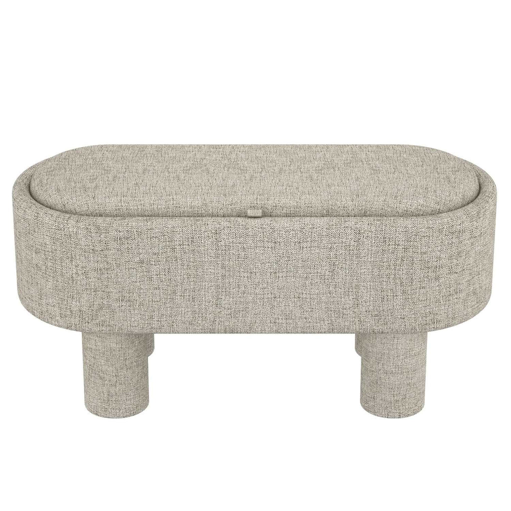 The Sezron Storage Ottoman Bench in Warm Grey combines modern elegance with practical functionality. Its oval shape and elevated linen fabric upholstery lend a refined look while the lift-off top reveals a deep storage compartment, perfect for stowing away essentials. The medium comfort polyester foam cushion offers both style and comfort, supporting up to 250 lbs with a convenient 19" seat height. Ideal for adding subtle sophistication and extra storage to any living space.