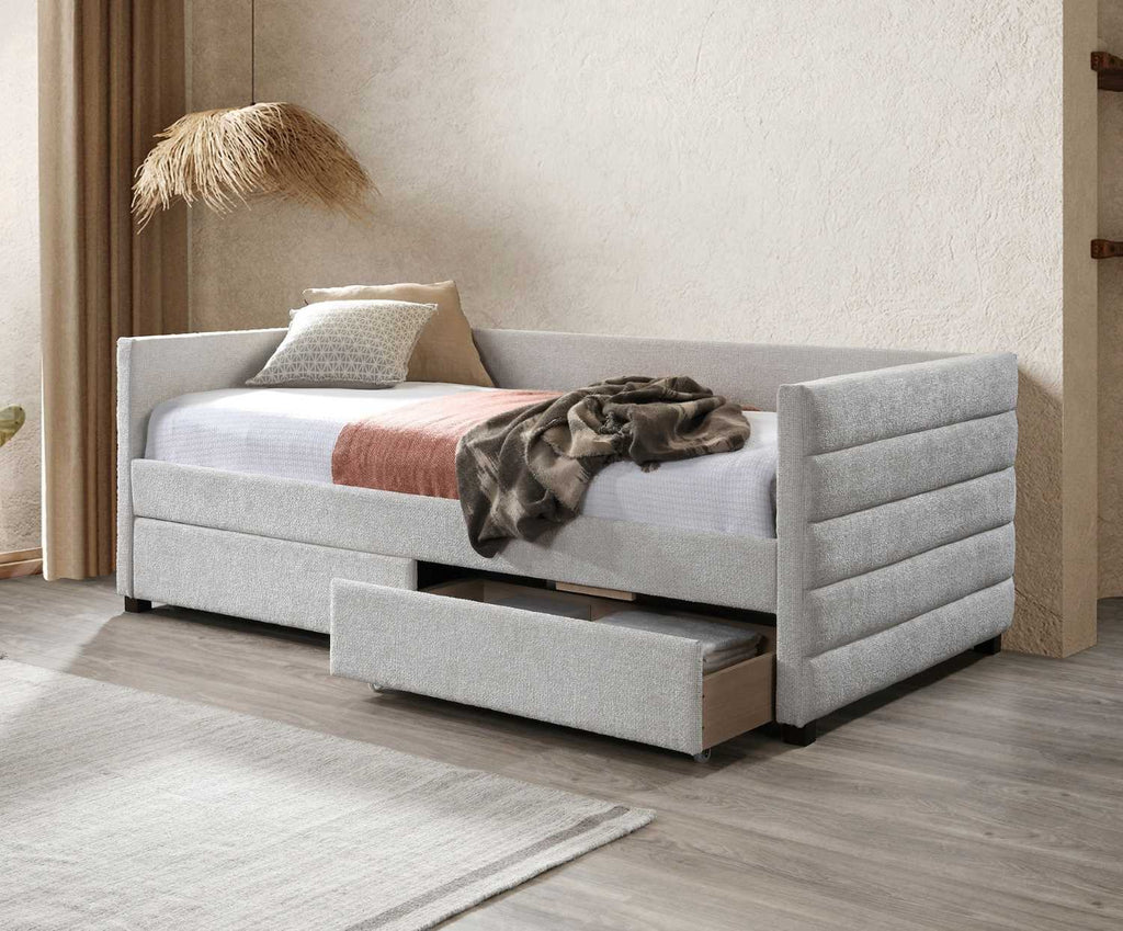 This single daybed combines elegant design with practical functionality, perfect for compact spaces like small bedrooms, guest rooms, or home offices. Upholstered in soft, light grey textured fabric, it features stylish horizontal channeled detailing on both arms and backrest, adding a refined touch. The built-in mattress support ensures comfort and convenience, while two pull-out storage drawers provide ample space for bedding, pillows, or seasonal items, helping you keep your space organized without sacrificing style.