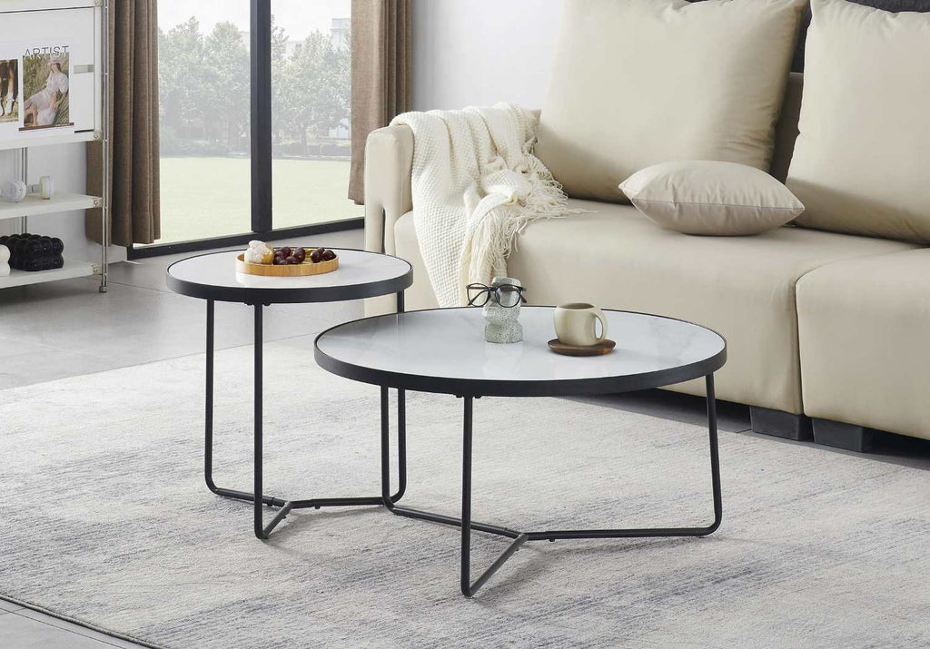 Elevate your living space with this exquisite set of two coffee tables featuring pristine snowy white sintered stone marble tops. The sophisticated contrast of the luxurious marble against the sleek black steel base creates a timeless aesthetic that complements both contemporary and classic interiors. Meticulously crafted for both elegance and durability.